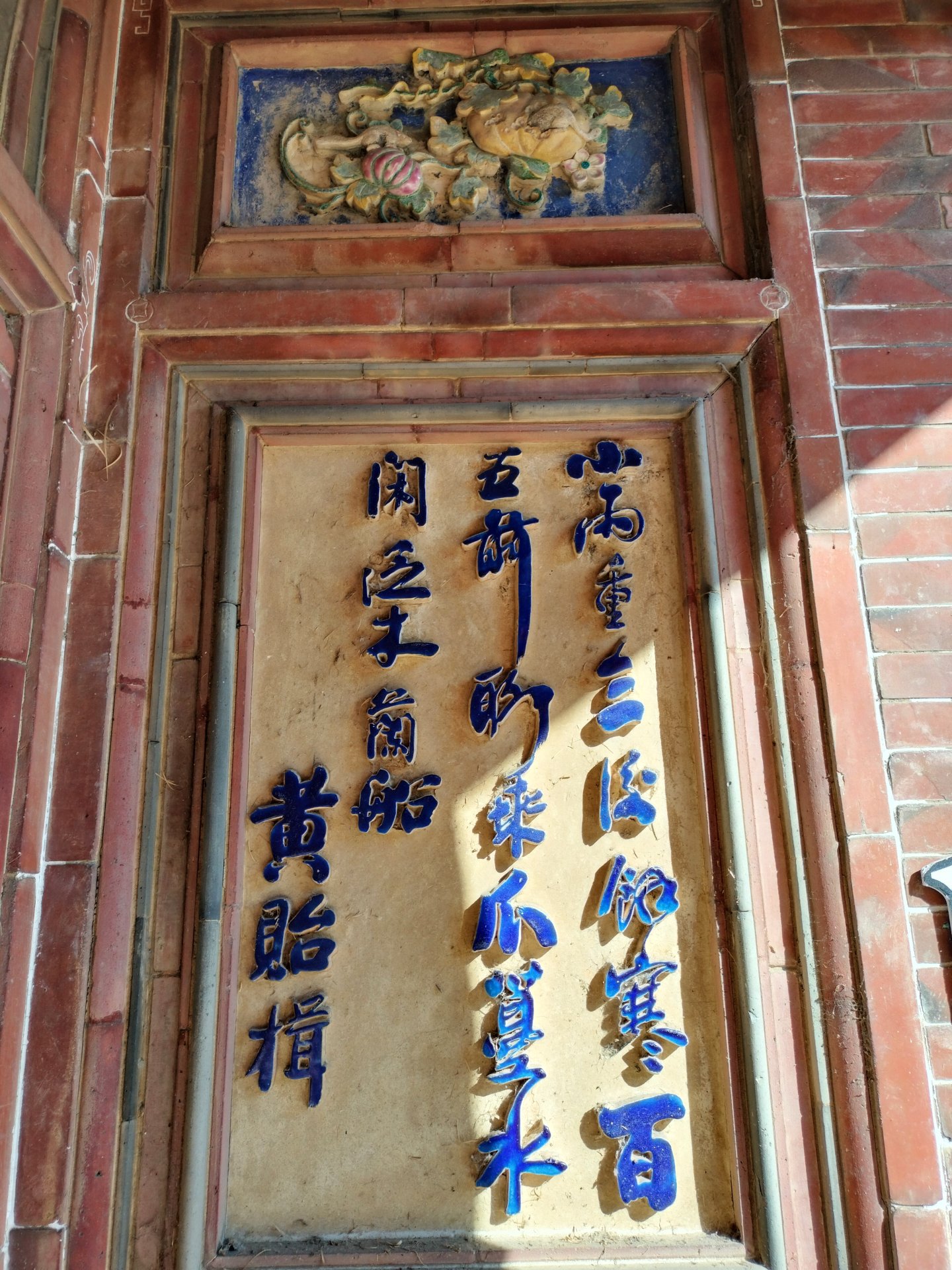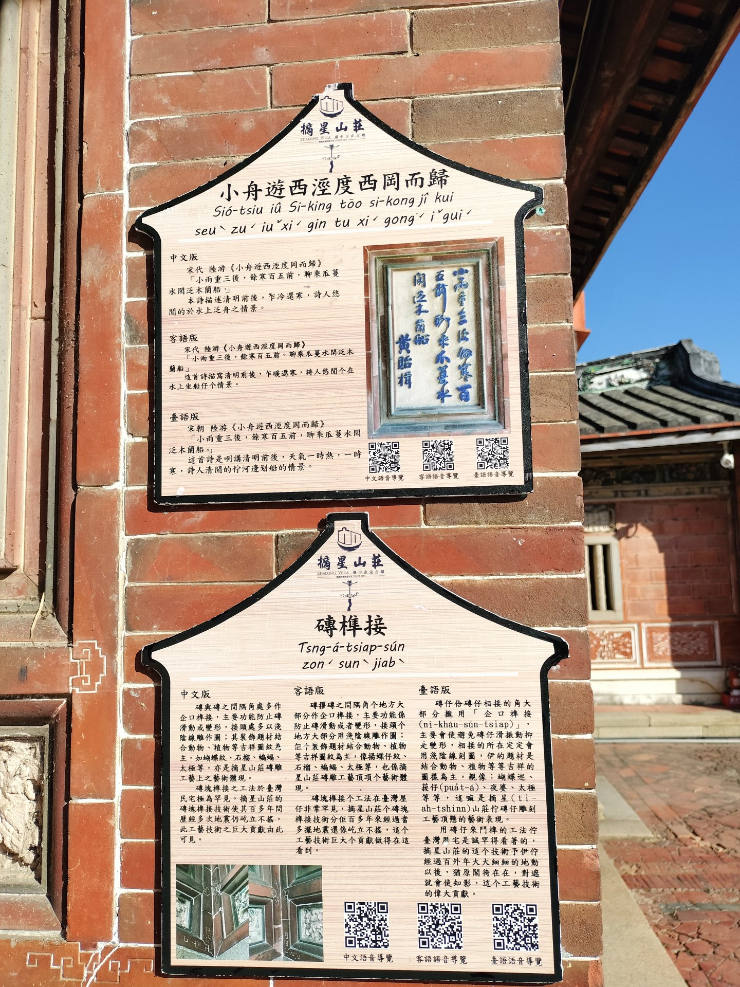 峰輿碑之間的陽角處精心運用金口埠接,主要功用在於防止磚塊滑動和變形,而旗頭點多以淺陰鎵壓作裝飾,呈現如園林的雅致。頭飾上的古祥圖紋結合各種斯物、植物,如蝴蝶效、石棉、蝙蝠、大極等,同時也體現了摘星山莊磚雕工藝的精湛之處。碑塊的榫接工法在臺灣相當罕見,而摘星山莊的磚鎖棒接技術,百多年來歷經多次地震仍然屹立不搖,顯示出這項工藝技術對於摘星山莊的巨大貢獻。這種優越的工藝技術不僅凝聚了歷史的痕跡,更傳承了藝術之美。