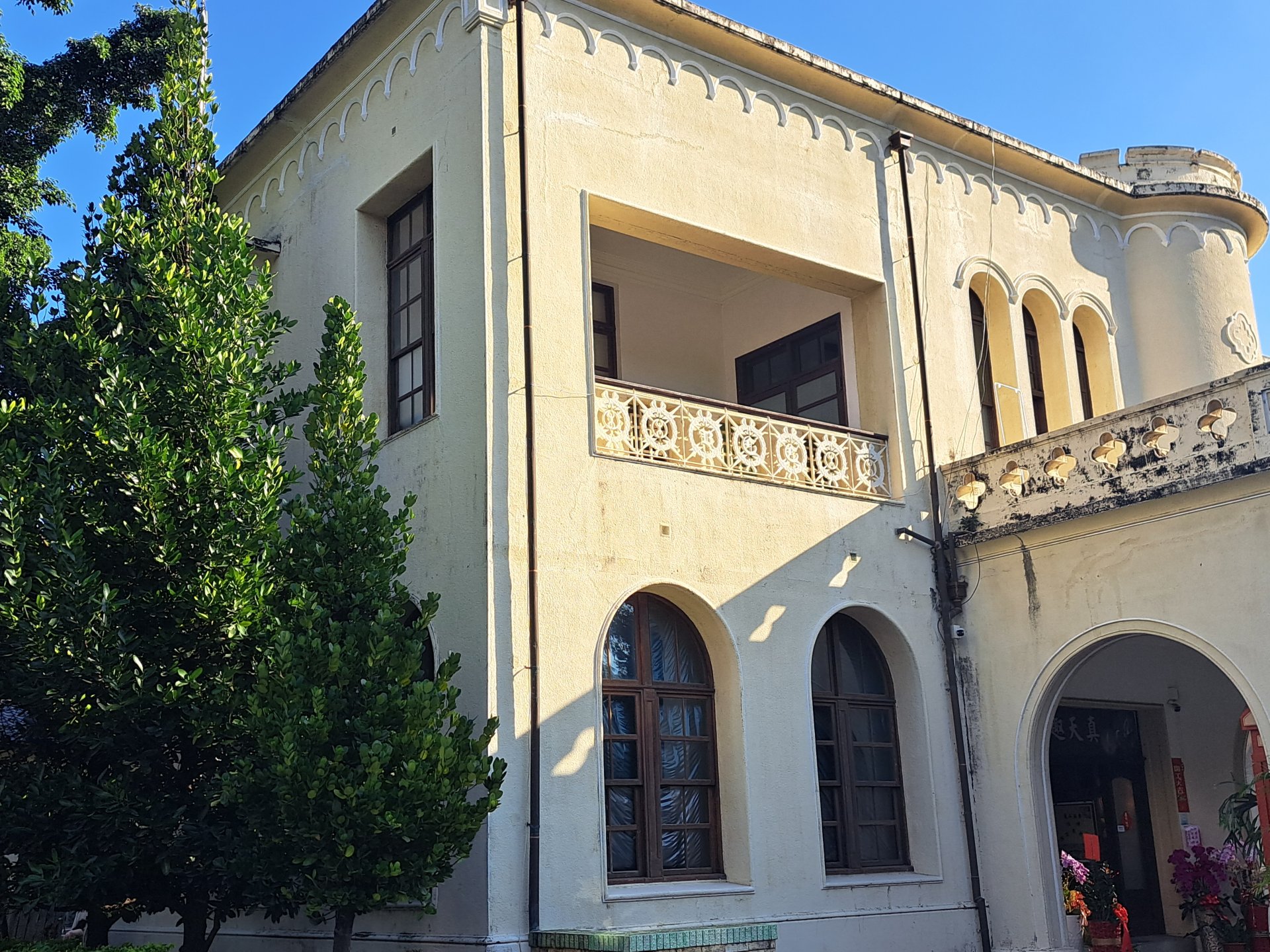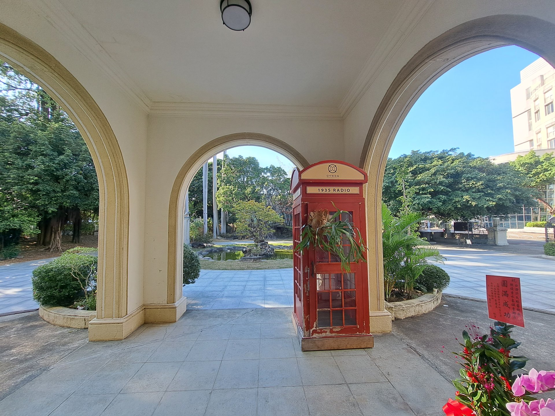入口擺了一座英式電話亭,與洋樓呈現對比