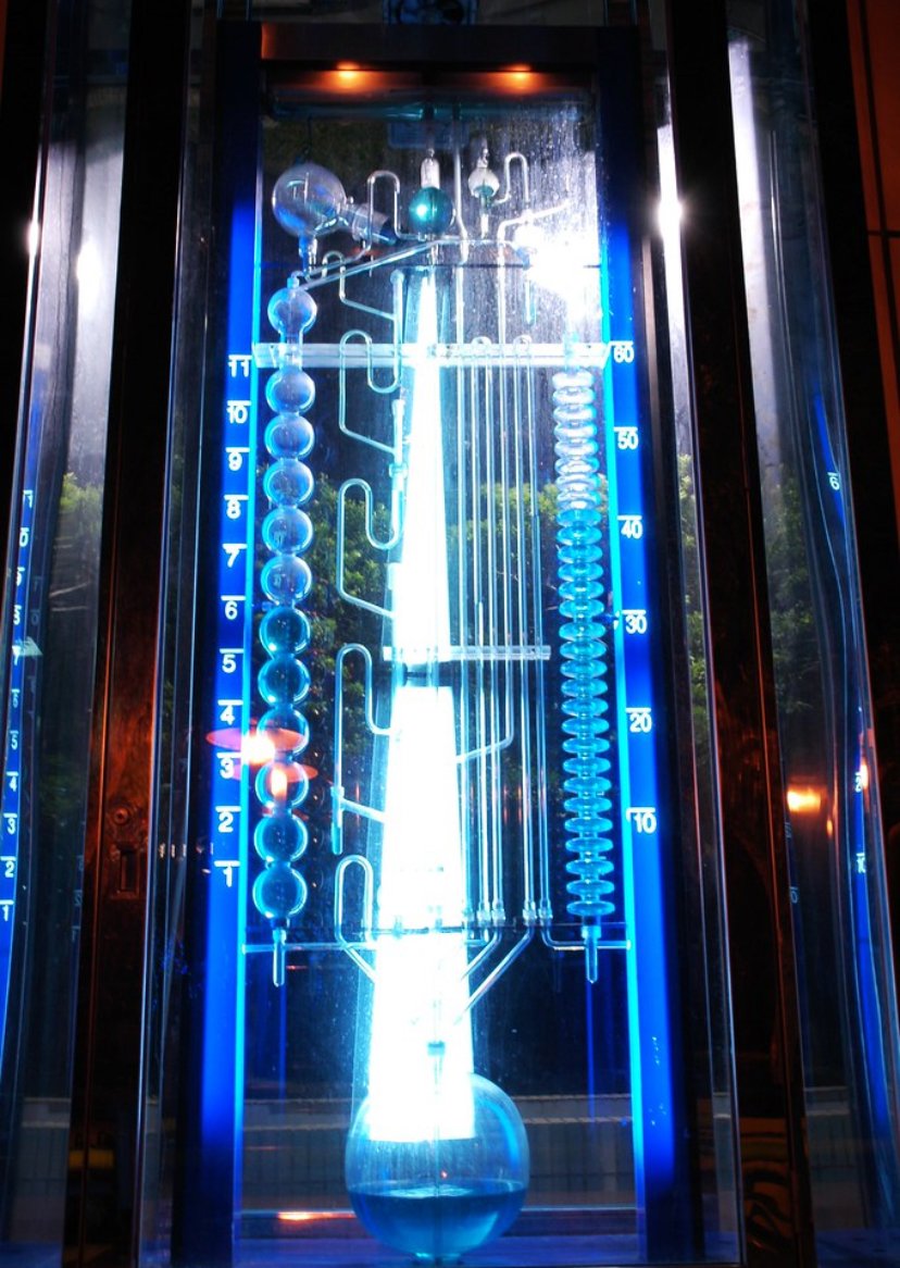 這座現代化鐘樓高達3.5公尺,為國內首座,由法國物理學家設計。結構由多種形狀、大小和功用不同的玻璃管構成,運用水的重力驅動鐘擺。透過虹吸效應,水超過彎管時被吸排至特定位置,精準計時。此獨特設計展現水的特性,融合物理學和工程學,成為精密且引人入勝的時間計量儀器。水鐘彰顯創新精神,成就科技奇蹟。