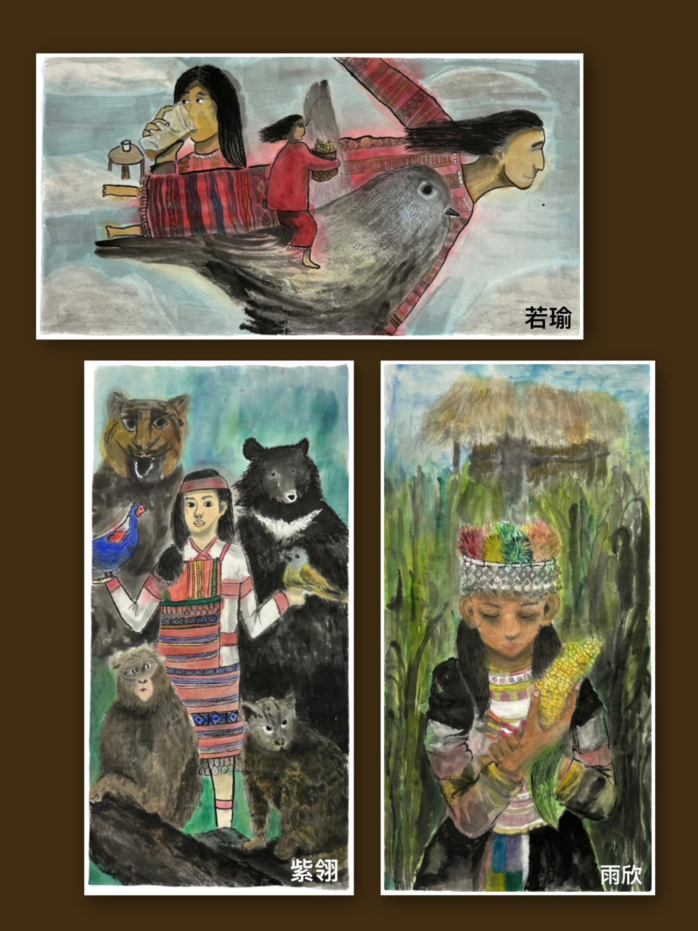 臺灣的原住民於各族中都有其不同的文化藝術面貌,也意味著各族間的精神與生活方式。我們除了在社會課上對原住民有初步的認識外,更透過蒐集資料的過程,發現了更多有趣的傳說故事、慶典、儀式等…並透過水墨創作的方式表現出來。
