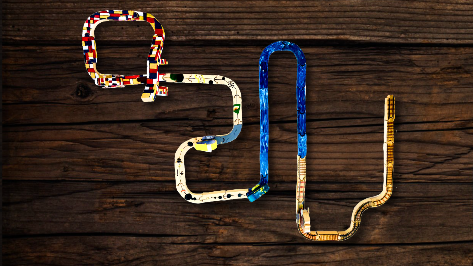 這是我們所製作的木作玩具,木軌道所拼出的樣子,正是421的形狀,除此之外我們還結合了所認識的藝術史風格作為軌道的圖案設計。