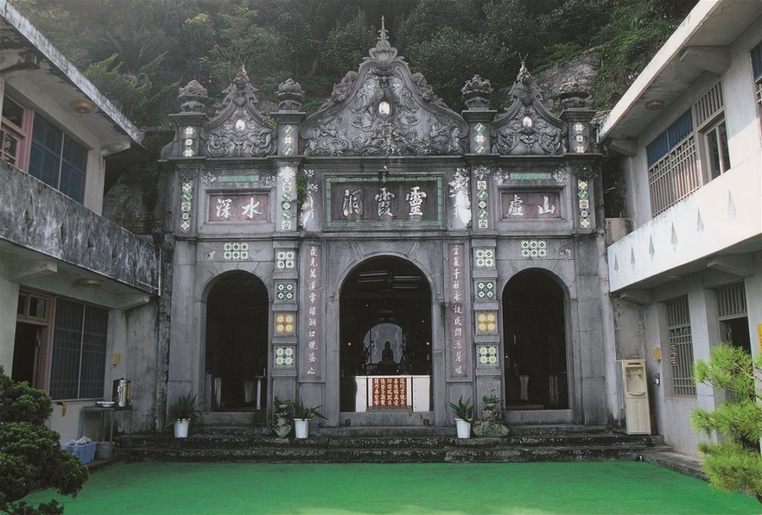 靈霞洞,建於日本大正6年間〈西元1917年〉,為一淺石洞構築之石廟。立面最特殊的為巴洛克式牌樓式門面,祀奉釋迦牟尼佛、伽藍菩薩、韋馱菩薩、阿難尊者、觀音菩薩。 日本昭和7年〈西元1932年〉,修築正面牌樓,左右各題「山虛」與「水深」二字,為德心和尚所題,每逢春季廟前一片雲海,洞前小溪流泉漩洩,因雲霧掩蓋,觀似水深莫測,故題「山虛」與「水深」。當陽光照射,雲海飄動,霞光萬道照射岩壁,五采繽紛隨雲海飄動挪移,氣象景觀變化萬千,故取名靈霞洞。