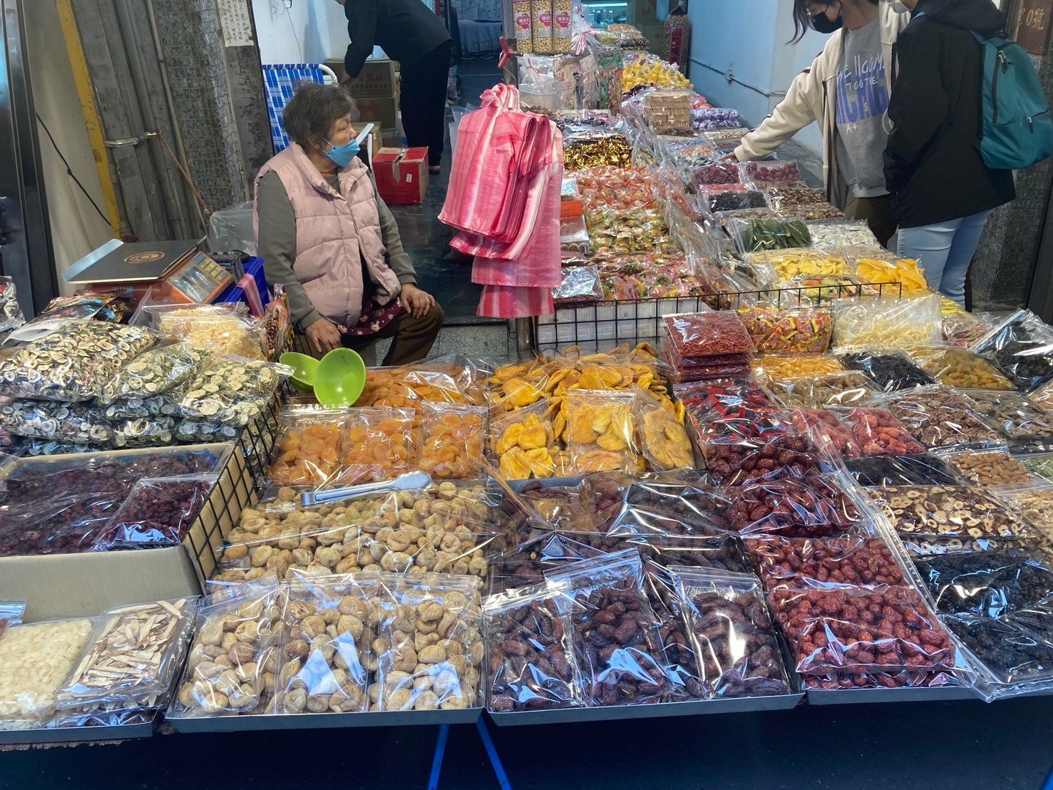 乾貨店攤販位置在民生市場建築物前巷子內,是一間流動攤販,不同時間會去不同地方擺攤,店內有販賣許多乾貨及小零食,像是椰棗、昆布、果凍,或是餅乾,滿滿一大包番茄薯條才100元,便宜又好吃。