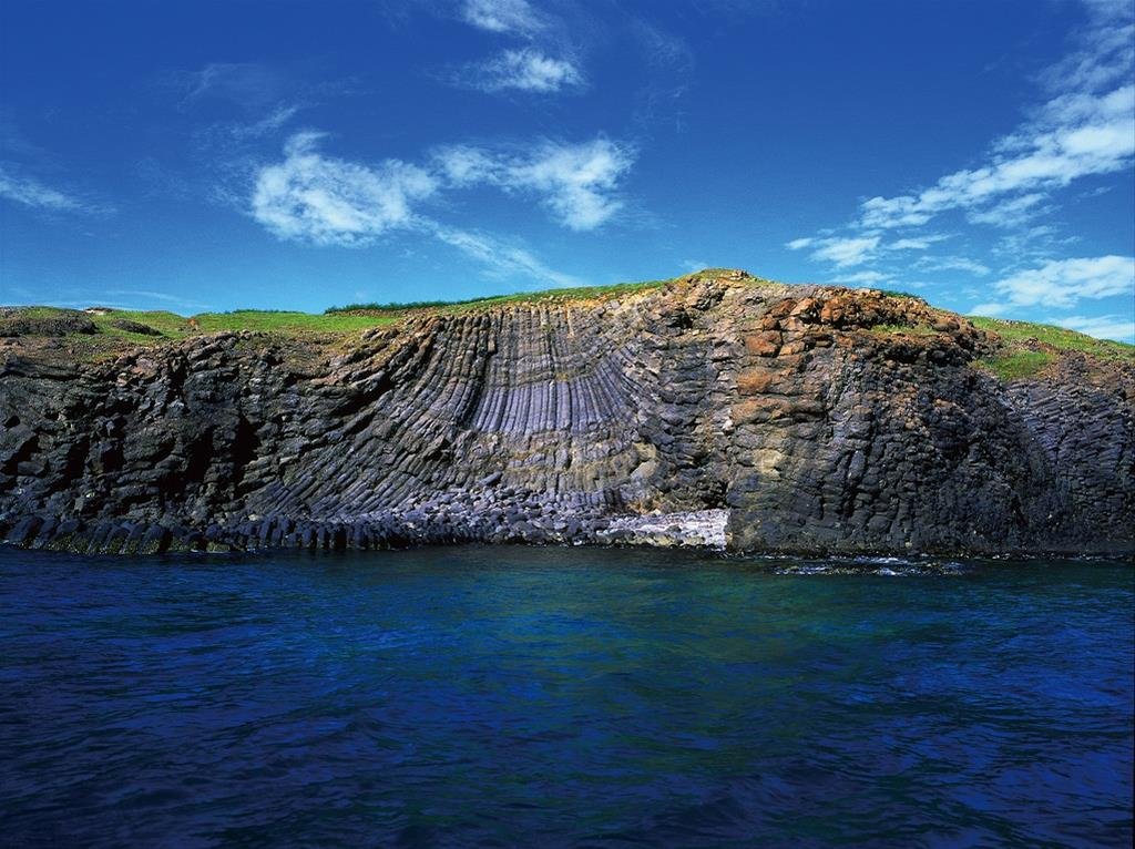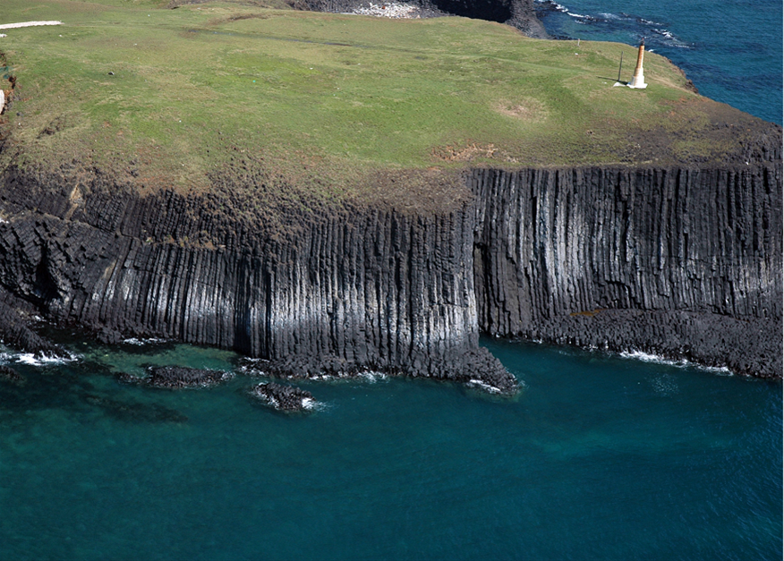 玄武岩柱從東岸一直延伸到北岸,形成高聳的海崖,下方的海蝕平臺則呈現出放射狀的玄武岩柱節理,玄武岩受到風浪侵蝕後,形成獨特的洋蔥狀的風化景觀,地形豐富多變。