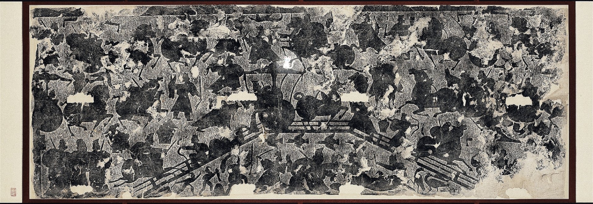 我緊隨其後,跑進202的「巨幅名作」,映入眼簾的是山東武氏祠左石室西壁下石畫像拓本,武氏祠位於山東省濟寧市嘉祥縣,是東漢晚期武氏家族墓地三座地面石結構祠堂及雙闕的總稱,始建於桓帝建和元年,畫七女為父報仇故事。
