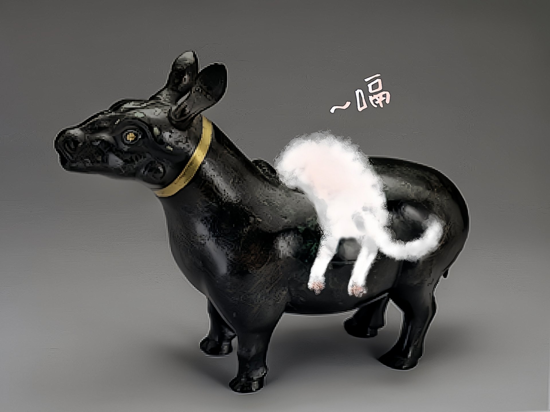 苦苦尋覓,上了三樓後,終於在305的「吉金耀采-院藏銅器精華展」看見小貓的蹤跡。彼時,牠正趴在犧尊背上,頭埋進酒樽內,咕嘟咕嘟的喝著酒,尾巴還歡快地搖了搖。
