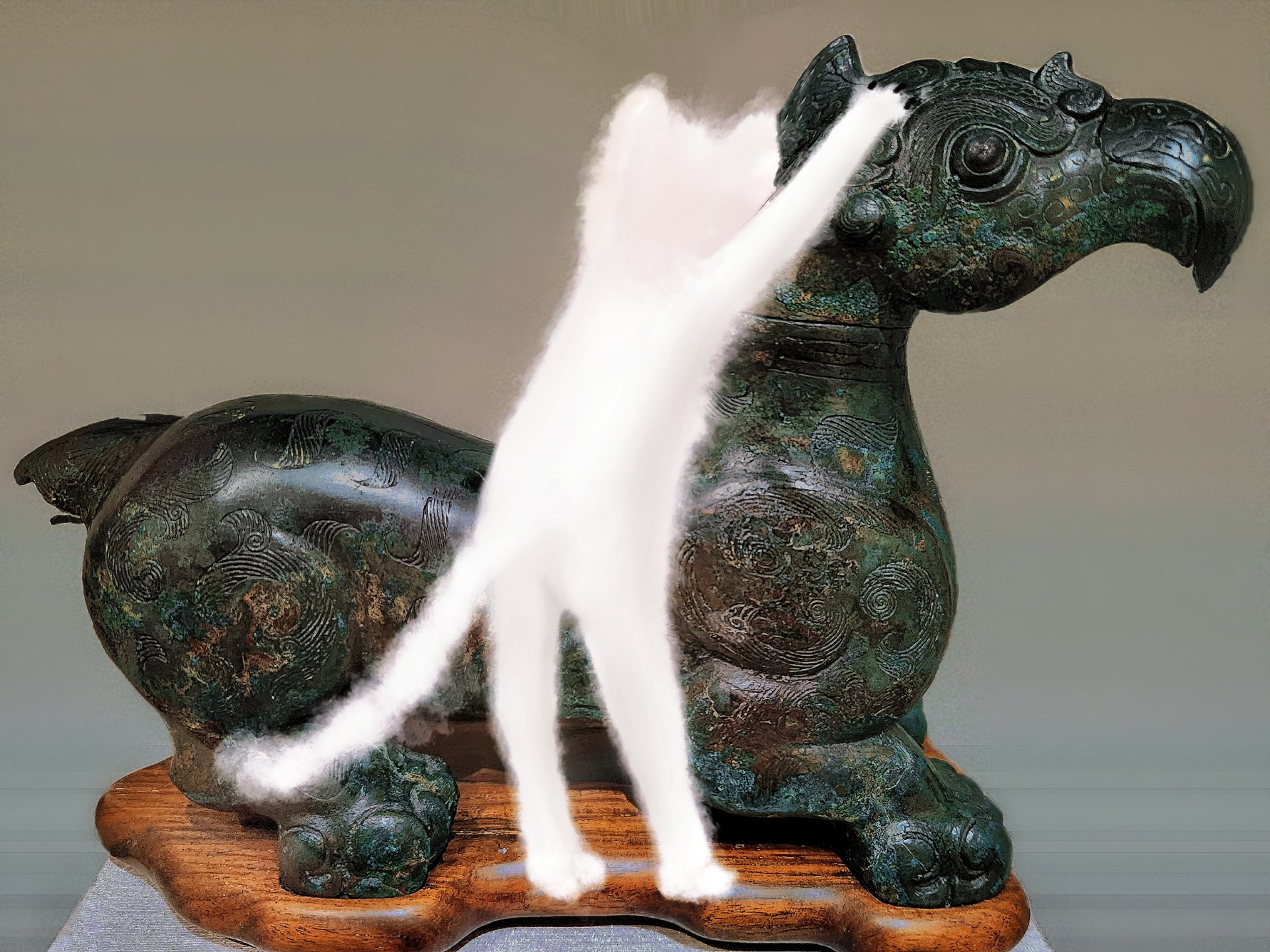 小貓喝完犧尊的酒,打了個酒嗝,又爬上鳥首獸尊的背,看來這隻小饞貓是喝的意猶未盡,我加速趕過去,牠發現我後,竟還用爪子抓撓了幾下鳥首,試圖開酒樽未果,才晃晃悠悠的跳下展台。