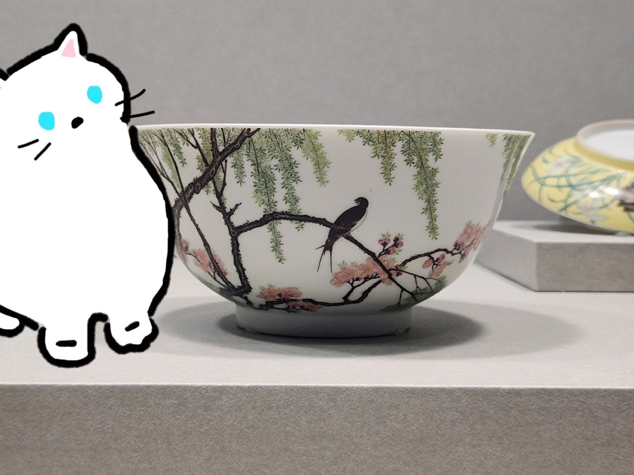 這個碗的整體施加白釉,碗內沒有装飾紋樣,外壁則描繪了柳燕圖,並在另一面用墨書題寫「玉剪穿花過,霓裳帶月歸」詩句。這是節錄明朝文人申時行的詩作,形容飛燕穿過柳蔭的畫意。詩句前面用紅色彩料書寫「佳麗」印,末尾則是「四時」和「長春」兩方印,碗外底部有藍色彩料書寫的宋體字 「雍正年製」款。