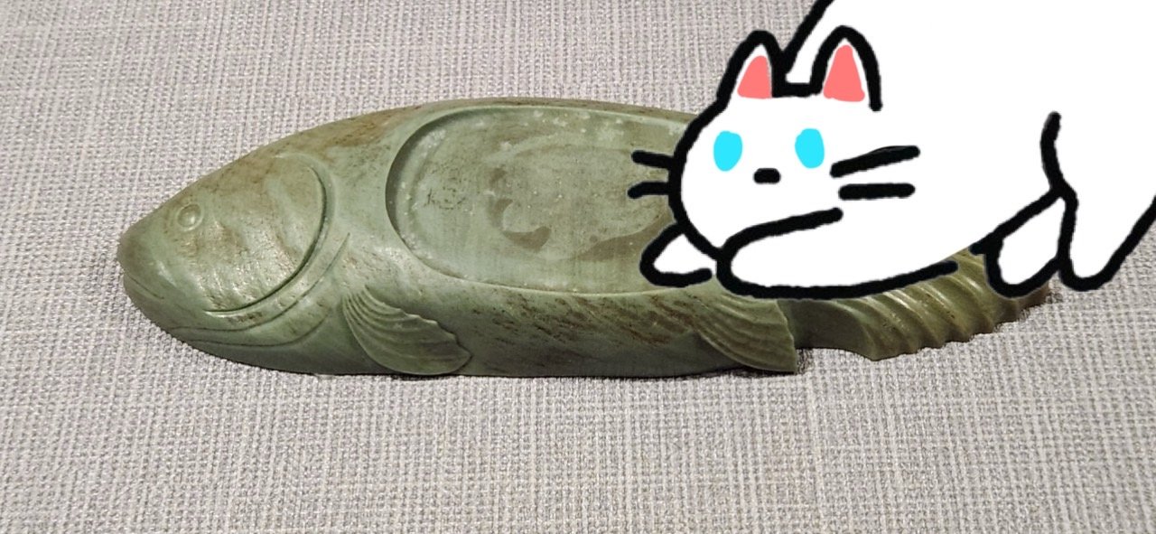跟著貓咪跑到了303的「愛硯成痴特展」,突然一條「魚」映入貓咪眼簾,牠馬上跑了過去,我也湊近一看,原來是一件雕刻成魚形的魚式硯。這塊硯台栩栩如生,彷彿隨時會游動起來。貓咪繞著硯台轉了一圈,仔細端詳著這件文物,牠輕輕地用鼻子嗅了嗅這隻「魚」,然後試探性地拍了拍硯台,硯台輕微晃動了一下,似乎對貓咪的「挑釁」作出回應。