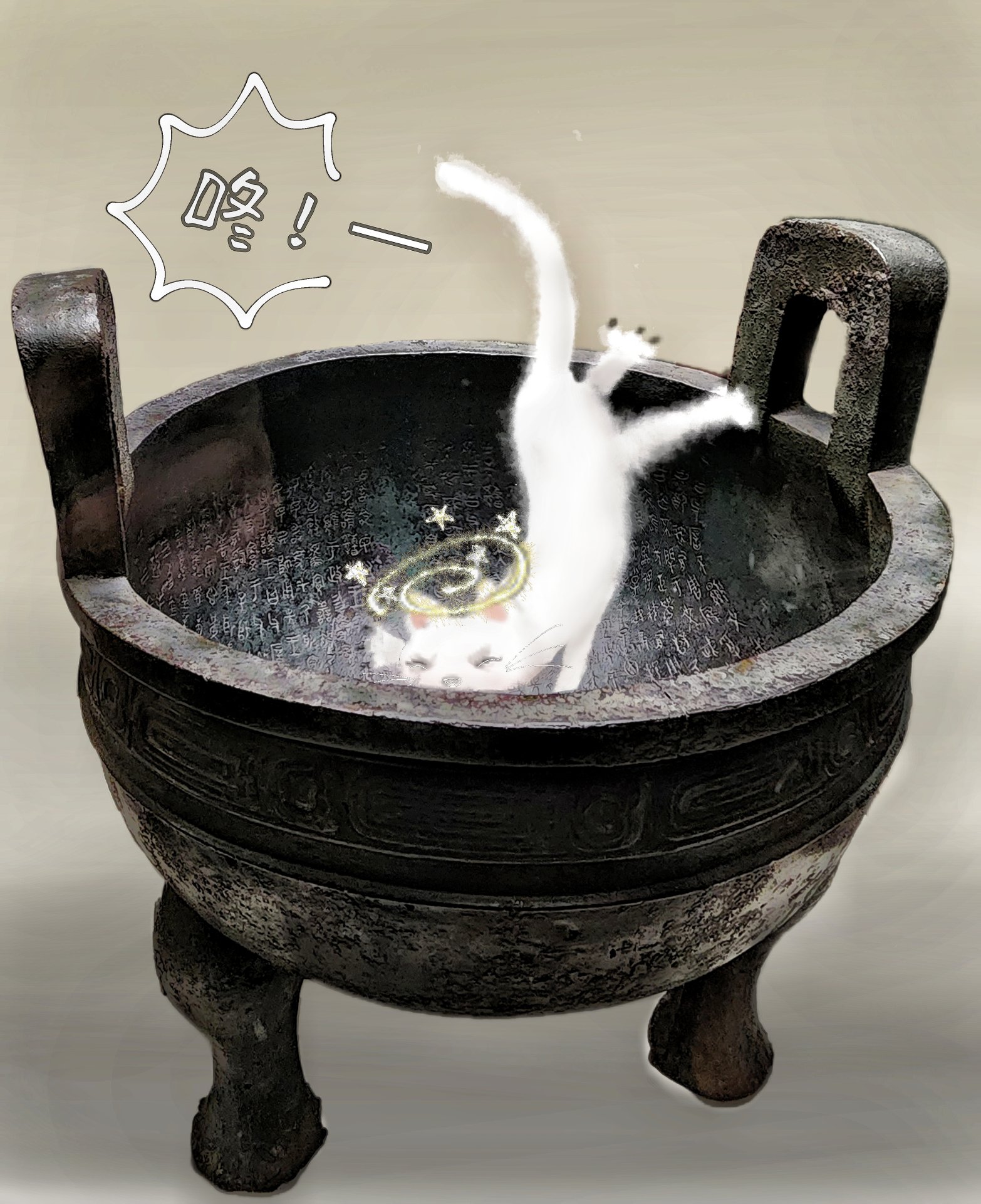 循著濃郁的酒香,展室的另一端,小貓咪正在文物間跳躍穿梭,不過,飲酒過量的牠早已醉的醺醺然,路過毛公鼎時,一爪踩空,滾進鼎中,跌了個倒栽蔥,撞得眼冒金星,爪子在厚重的鼎沿扒拉了幾下也出不來。