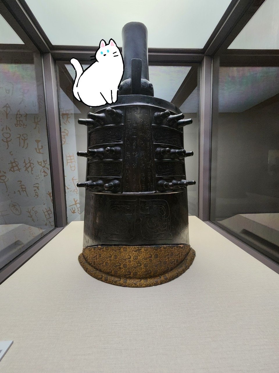 又跟著貓咪跑到了305的「吉金耀采-院藏銅器精華展」貓咪發現了一件巨大的青銅器—宗周鐘。貓咪被這件壯麗的鐘所吸引,牠輕輕地走近它,用鼻子嗅了嗅那帶有青銅味道的空氣。貓咪靈巧地跳上鐘身,輕輕敲打鐘身,發出低沉而悠遠的嗡嗡聲,貓咪聽著這聲音,眼睛半閉,彷彿進入了一個古老的時空,幻想著宗周鐘在古代被敲響時的景象。