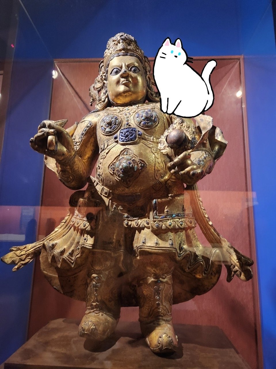 又跟隨著貓咪跑到了101「慈悲與智慧-宗教雕塑藝術」,一件高大而威嚴的青銅鎏金南天王立像映入了,我們的眼簾。這尊南天王立像高大雄偉,貓咪被這尊立像的威嚴氣勢深深吸引,牠輕輕地走近,仰望著南天王那威武的面容。牠繞著南天王立像轉了一圈,仔細觀察著立像的每一處細節。