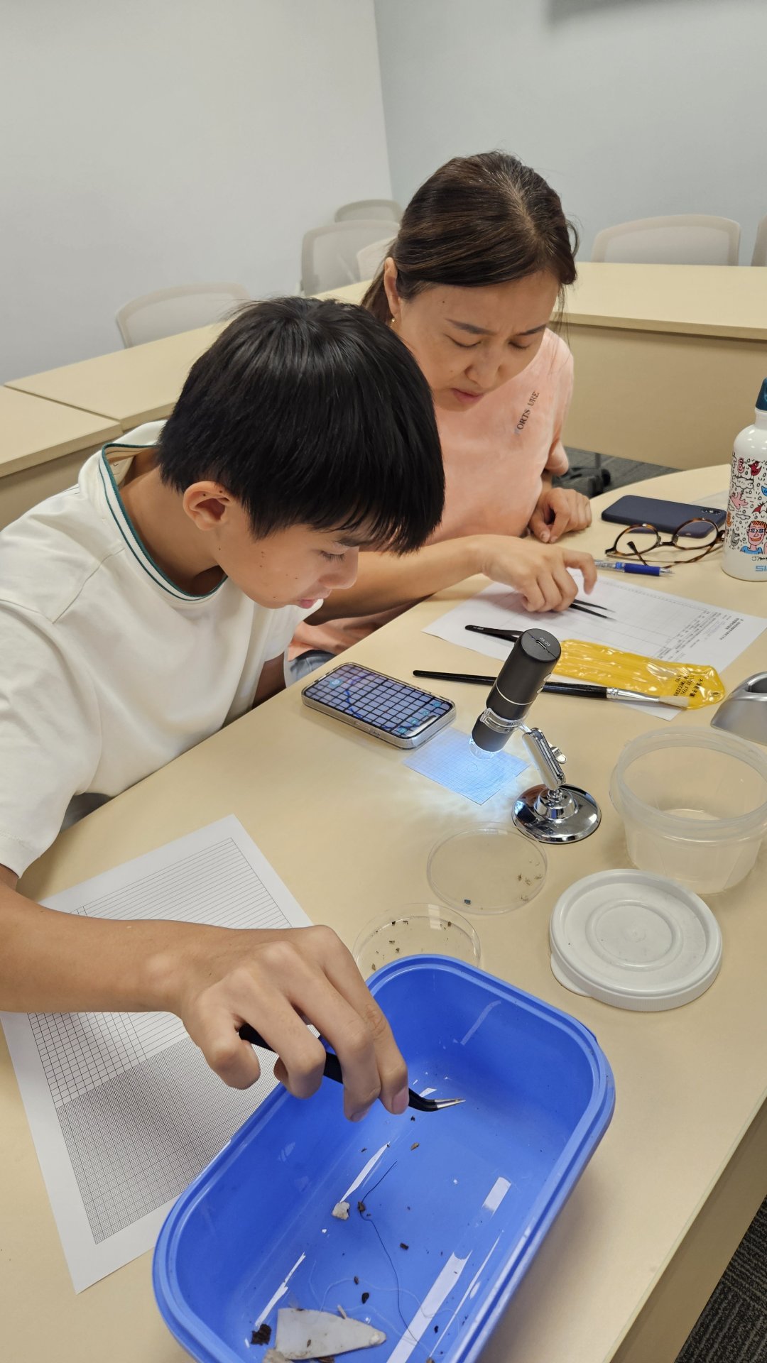 兩天共4場的「微塑膠樣本處理工作坊」由香港城市大學海洋污染國家重點實驗室協辦,提供場地及專業顯微鏡。工作坊中各位參加者將之前10次海岸清潔時收集到的微塑膠進行分類、統計及紀錄以供布博士進行後續分析。