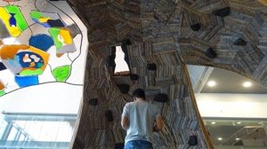 第四片弧形物件,支架由廢棄鋼筋焊接而成,塑膠片經過裁切拼貼,運用淡黃色的尼龍魚線和透明釣魚線縫補成為一格格繽紛的圖案,遠看像教堂的彩繪玻璃,近看像拼布,每一塊上頭都有一種魚類或人的表情圖樣,像是獨立被擺放在各自的彩色空間裡。