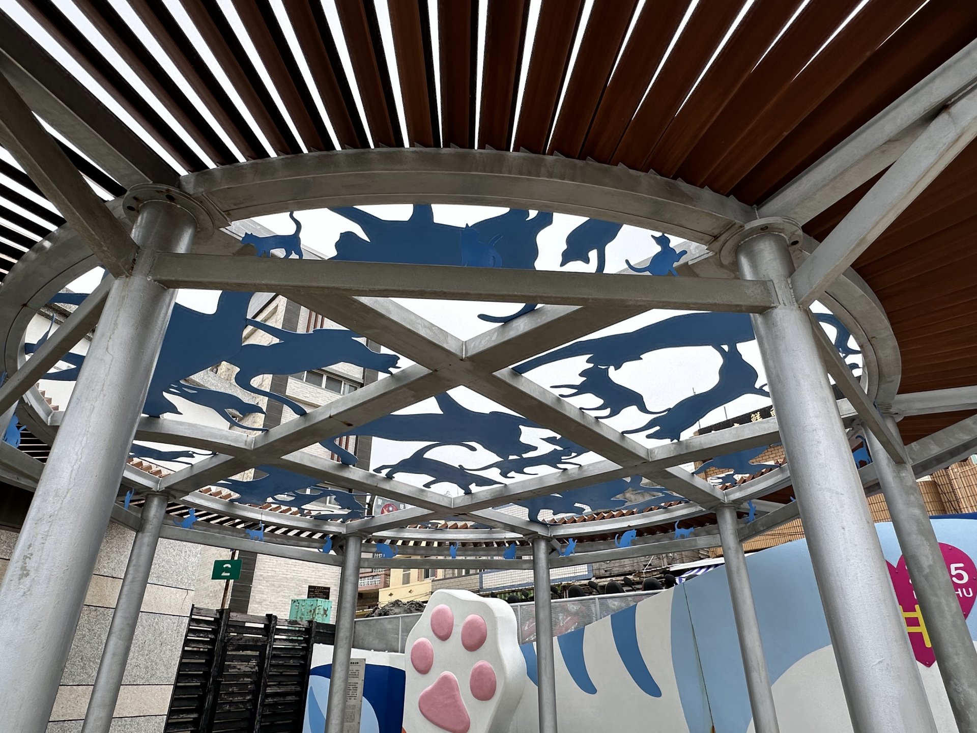 虎井嶼是澎湖著名的旅遊景點,為了突顯其特色,縣府對虎井碼頭旁的涼亭進行了改造升級。新設計的涼亭以「貓」為核心概念,並融入「虎井」的象徵元素。其頂部採用「井」字形結構,搭配貓形鏤空裝飾,增添視覺特色。此外,地板則運用窯燒陶板拼貼出貓掌圖案,使整體環境更具可愛氛圍。涼亭旁的民宅圍牆也裝設了陶板藝術牆,融合貓咪圖案與「汝好」字樣,展現當地居民的熱情與友善。