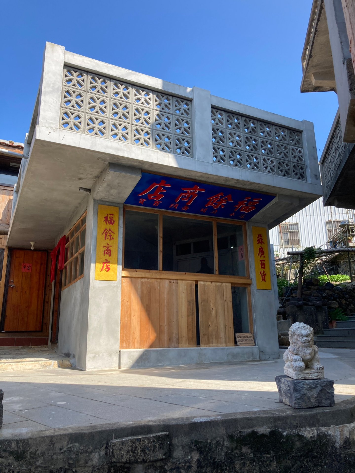 此建築為「五靈公廟」屋主陳春霖晚年時為兒子所建,仔細觀察兩棟房子,找出屋主的建築特色吧!當時施工所用的洋灰中參雜了許多海砂,為確保結構安全,屋主特別進行了多層去除鹽分的處理,因此整體質感細膩,與一般房屋有所不同。這裡曾是全村唯一的乒乓球台營業場所,如今成為陳家後代回到莒光時的居所。