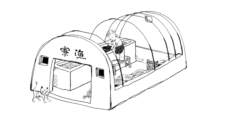 水泥牆體、半圓拱頂的漁寮,從前是居民在漁獲豐收時,以鹽巴醃漬魚類的場所,漁閒時則可用來擺放大型漁具。