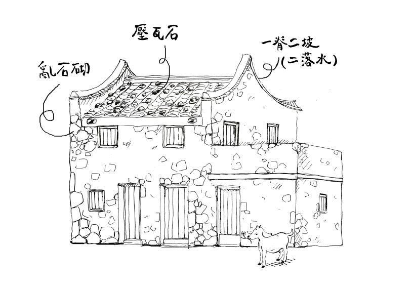 房子為標準閩東式建築。早期家屋材料取得不易,牆體石塊皆由山上或海邊取得,打磨平整後,以亂石砌工法築成,屋瓦上壓放石塊防風。
