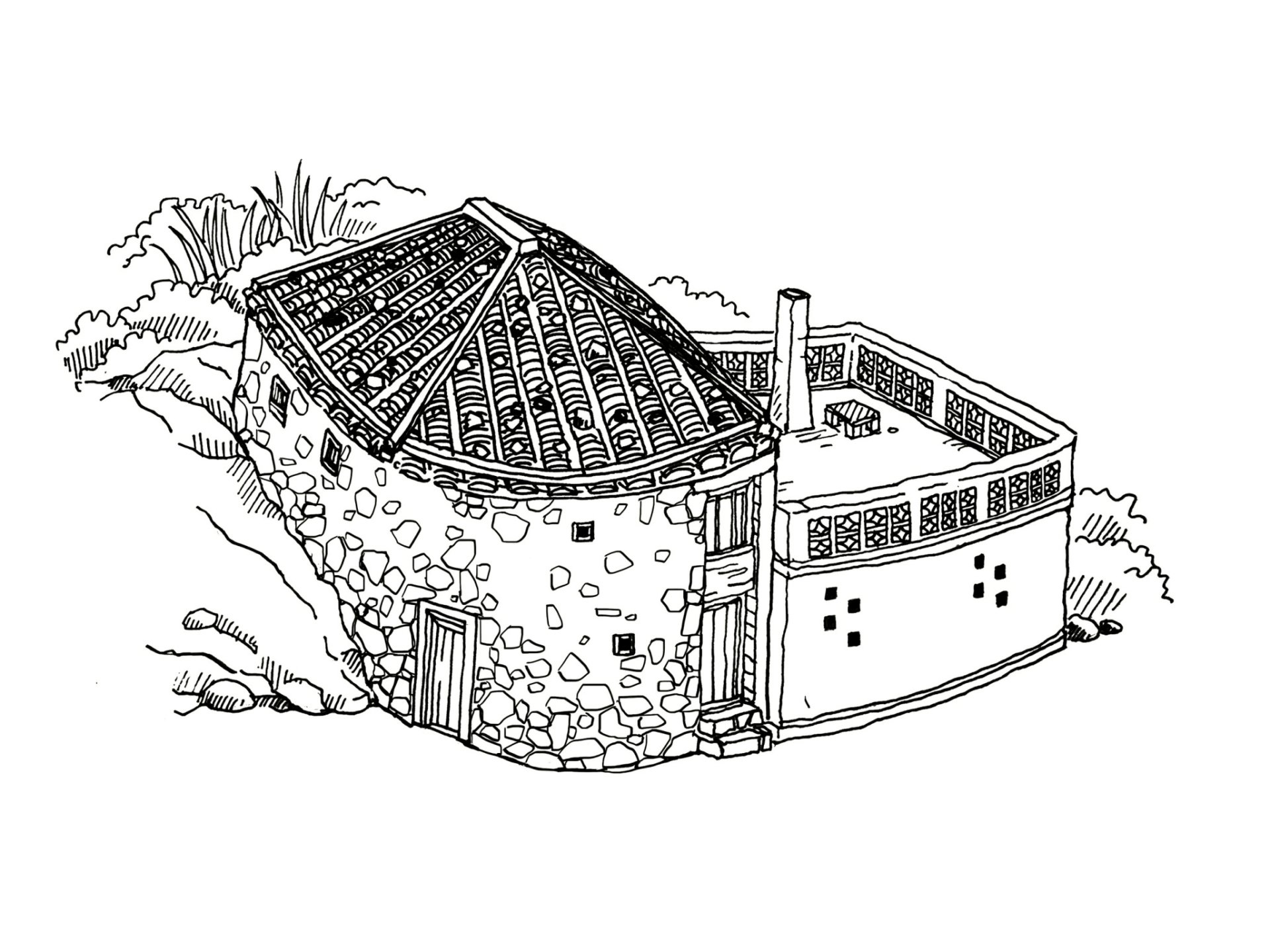 鑲嵌在石壁上的百年石屋,順應傾斜山勢築成弧形坡面,是大浦聚落現今少見仍在使用,並保有舊屋型結構的傳統石屋。據傳為了打造出圓弧建築結構,施工時替換過數批木工師傅,最後才得以完工,是四鄉五島難得一見的建築形式。