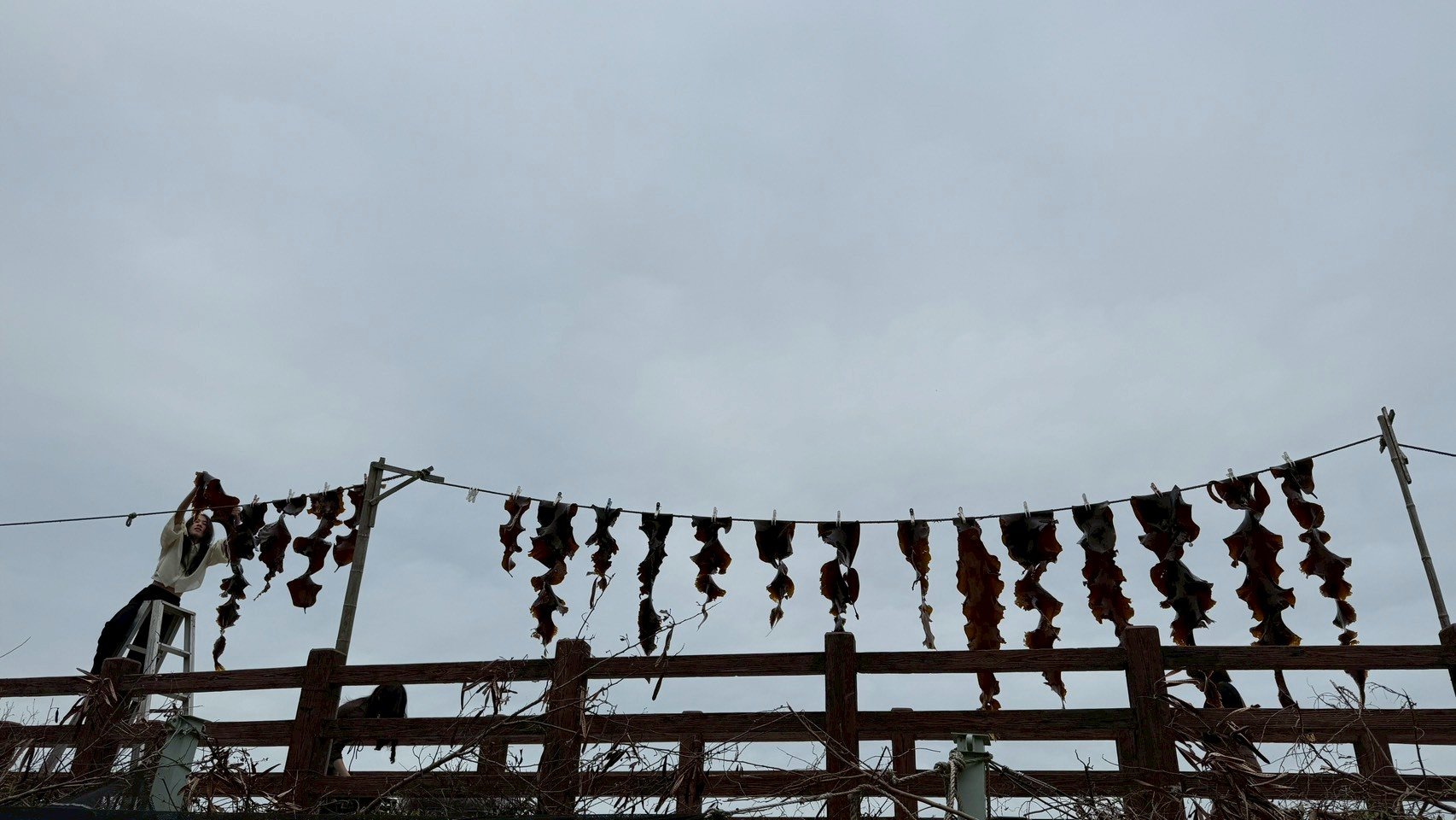 自芙蓉下屋屋頂延伸的階梯裝置,拉起延展的繩,延伸至海堤而垂下,周邊有木柱與繩的設施,為藝術家-Shai Tamir(曬)協助漁民製作的地景裝置「繩梯」,提供曬製昆布等使用。