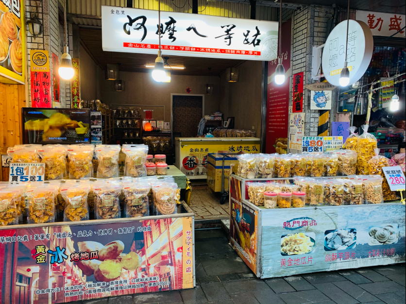 而這台灣濃濃的人情味,也在金山老街發光發熱!「阿嬤ㄟ等路」在親切可愛的阿嬤與兩個兒子的用心經營下,商品不斷推陳出新——暢銷熱賣的黃金地瓜片,香甜酥脆紮實,讓人吃一口就停不下手;好山好水種出的金山地瓜,滋味甜美且富含營養,能幫助整腸消化,是現代人的天然健康食品;其他還有鹹酥芋頭片、耳朵餅、小煎餅、肉乾等,不分年齡,都叫人愛不釋手!