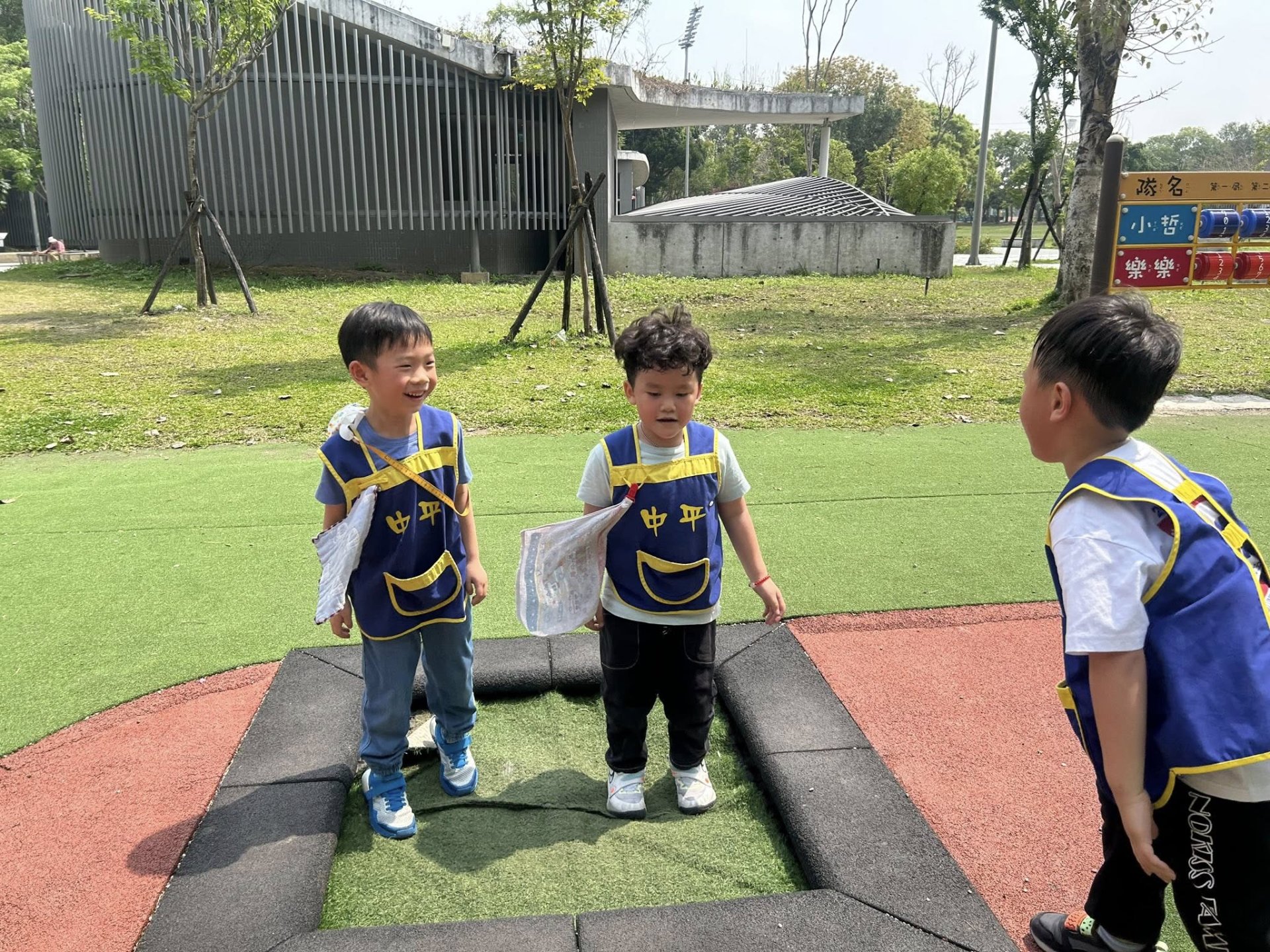 這裡是中平幼兒園,這裡有很多學習區可以玩,有很多的教具、玩具,我們還可以到樓下的綠地跑步、跳舞、看風景、拍照,綠地旁邊還有水池跟菜園,水池裡有養烏龜,菜園有很多蔬菜,這裡可以交到很多新朋友。