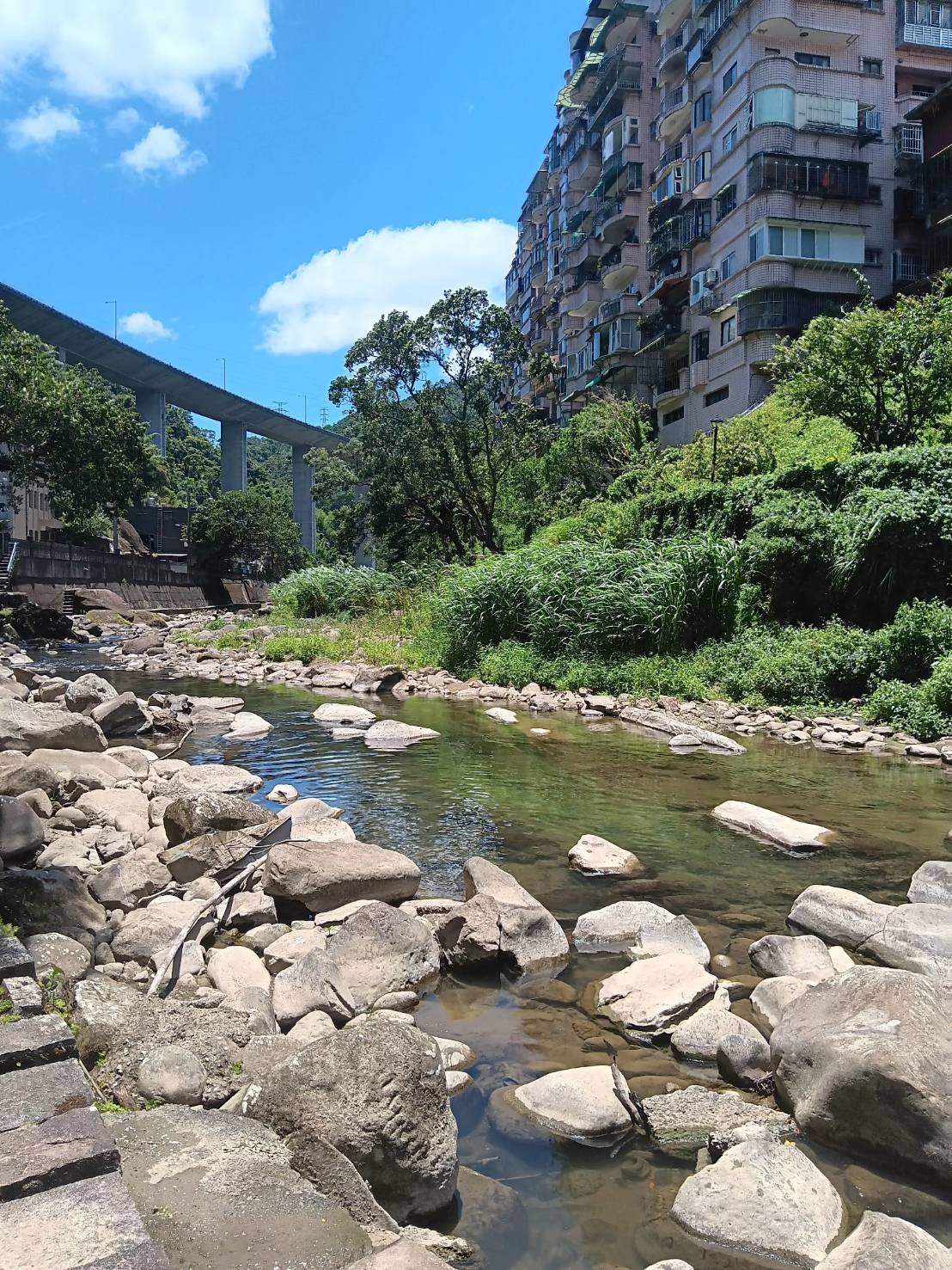 石碇西街的河岸是以前船隻來往的地方,有時候船隻需要逆流而上,所以會有挑夫走在岸邊幫忙拉船,甚至會泡在水裡拉,而現在這裡已經無法載船了,但是在夏日裡來到這種地方也是蠻不錯的選擇,既能享受優美的風景,又能享受河水帶來一絲絲清涼。