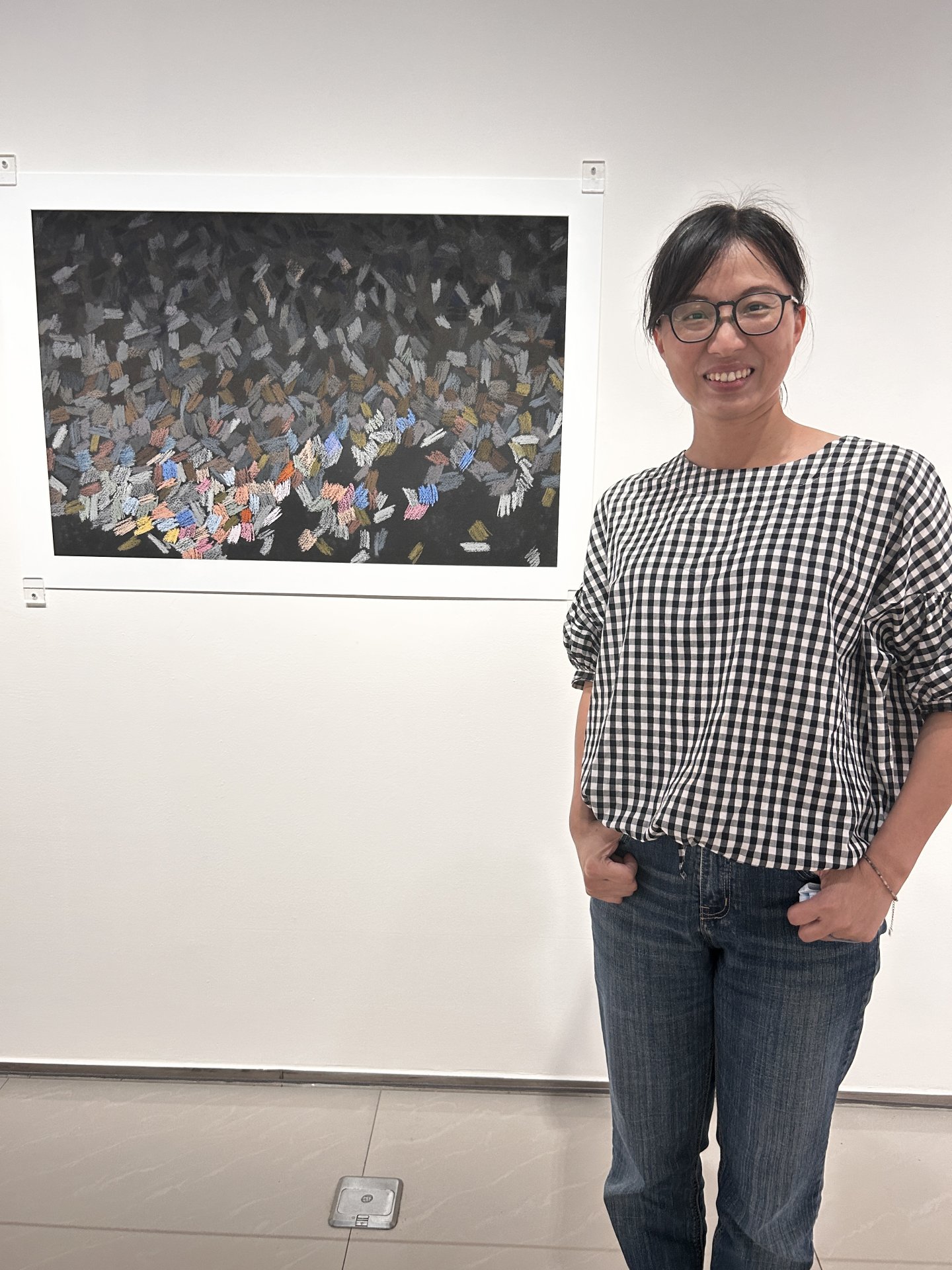 這幅畫作從左下方開始,一方一方鮮明的色塊,層層往上堆疊,越往上,顏色越暗淡。在畫布最上方,只剩下模糊的黑色、灰色,像慢慢淡去的記憶。這就像面對一件事情發生,剛開始情緒很濃烈、感受很鮮明,時間一久,心情淡了,記憶也模糊了。它不一定被遺忘,但感覺不再刺痛了。貽娟老師的作品像一句溫柔的提醒,告訴我:「無論當下有多難熬,時間總能慢慢撫平一切,讓心一點一滴回到平靜。