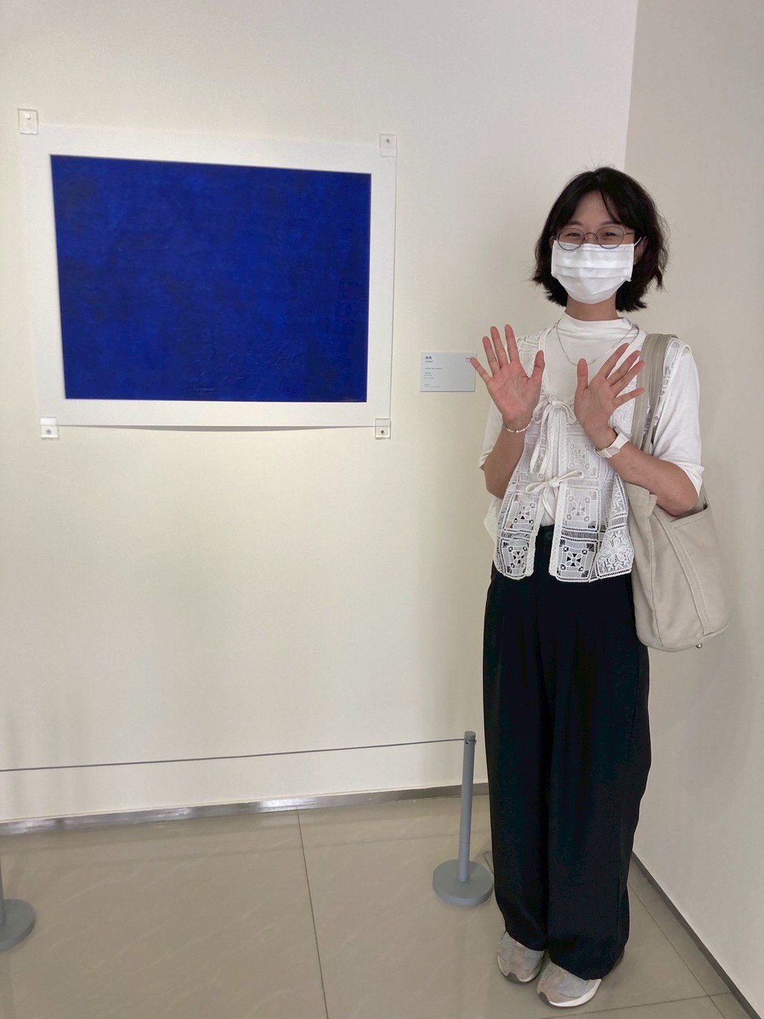 這件作品是謝貽娟的《無題》,她以雙手接觸藍色礦石粉末,創造出宛如海浪、瀑布般流動的質感,深邃的藍,形成靜謐的空間,位於作品下方中心的手掌印,留下自我參與的痕跡。