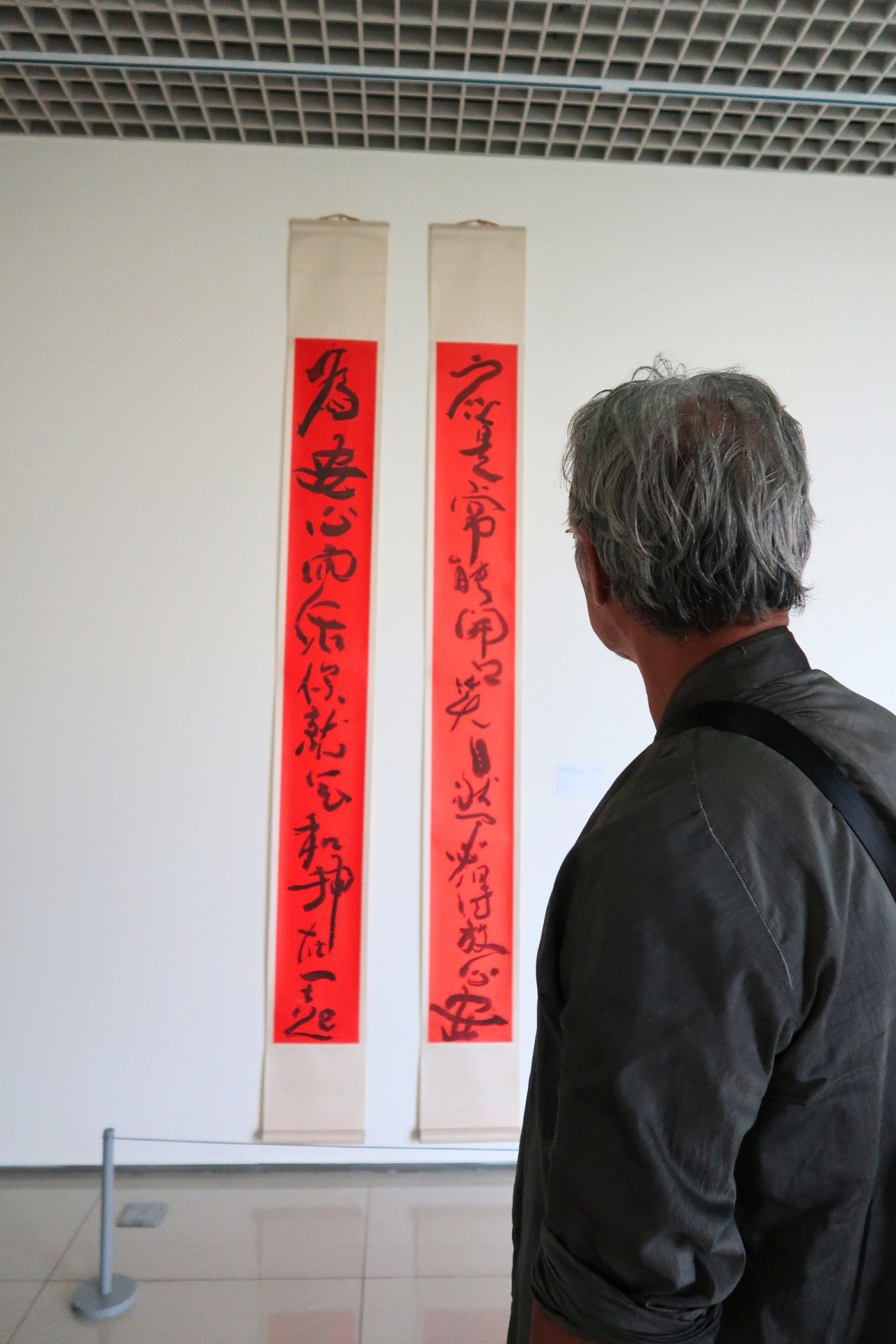 這次的展覽作品當中,我想分享的是她的毛筆(作品)。那件毛筆(作品)是用紅色的紙,上面用黑色的墨汁寫的。它內容是這樣子:「應是常能開口笑,自然必得放心安。」這是右邊聯;左邊聯:「為心安而活,你就會和神在一起。」我想她的文意就是說我們要常常能夠開口笑,因為常常我們的心裡很多的鬱悶,常常笑不出來,而且笑的時候就很不自然。所以我們的老師曾經教過我們一個方法,他說:「你就照照鏡子,看看鏡子裡的你,微笑的臉、嘴巴、眼睛,有沒有哪個鏡頭是看起來最舒服的。那通常是稍微微笑的狀態會是最舒服的。」他說只要每分鐘維持那個狀態,你的心就會開朗,所以說「開口笑」很重要。
