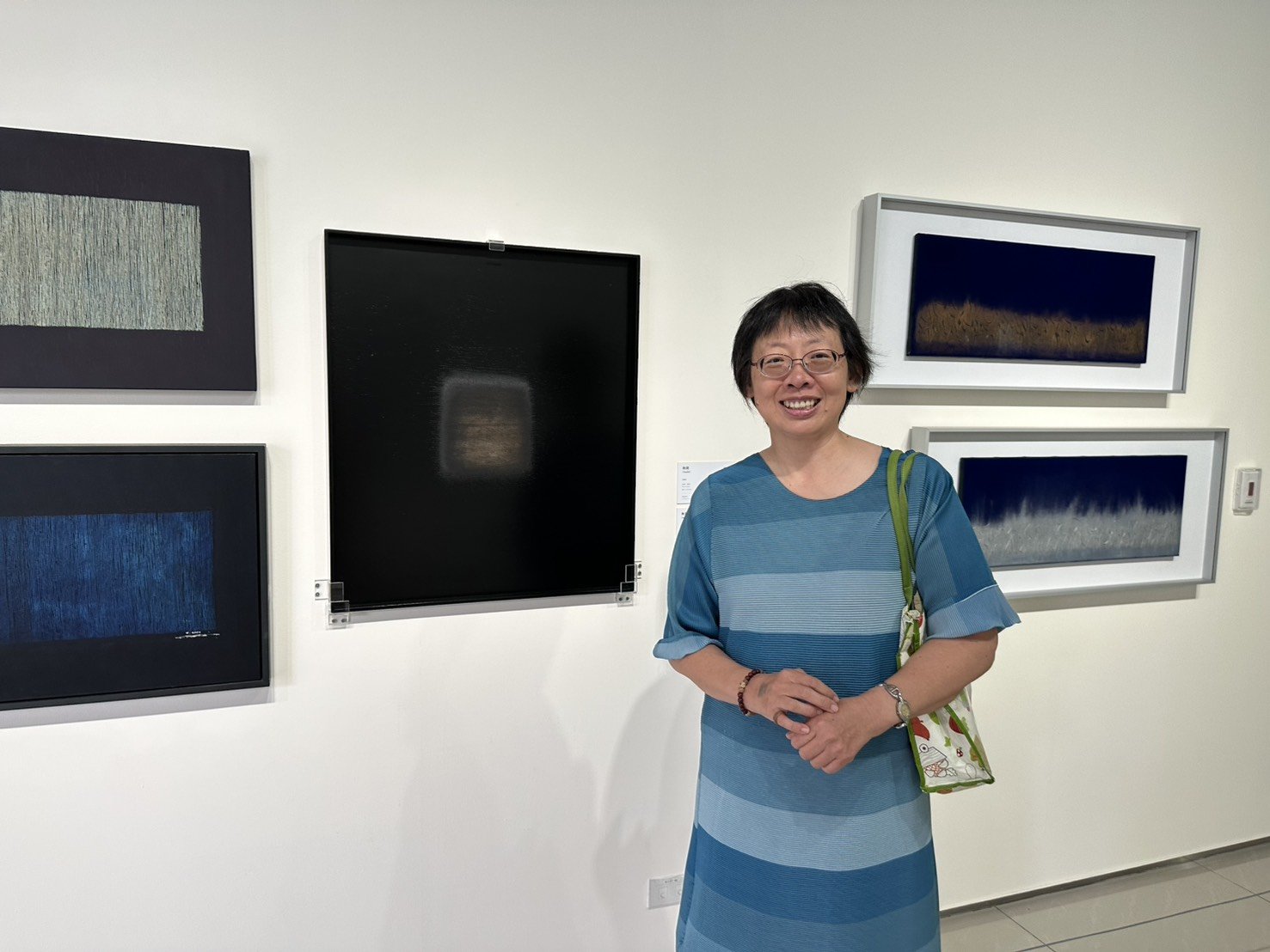 (作品裡)這句書法是錦繡老師跟著陳丁奇老師在寫書法的時候完成的。我覺得她的書法的線條跟她畫樹葉時的線條不謀而合。字的轉折、筆跡的轉折、線條的轉折,可以在畫樹的系列中看得非常清楚,它脈絡是可循的。這是她畫樹的手法,但她對於思想的理解上,蔡肇祺老師對她的影響是蠻大的,是她對於人生理解關鍵性的指導老師,所以她就把蔡肇祺老師寫的這兩句話寫下來,然後就用陳丁奇老師教導的手法寫成這個書法(作品)。