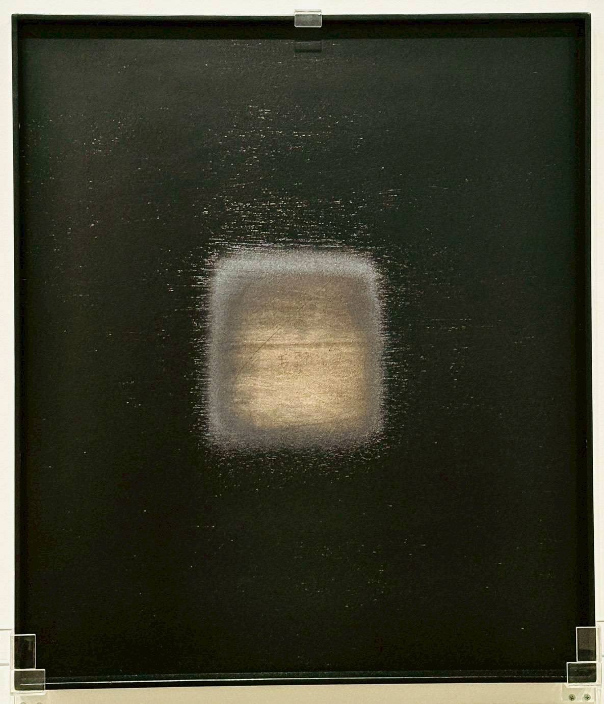 這是一個木頭夾板,她在黑色的塗料上,用刮刀撥開內在掩蓋的光亮,那是需要勇氣和力量的。