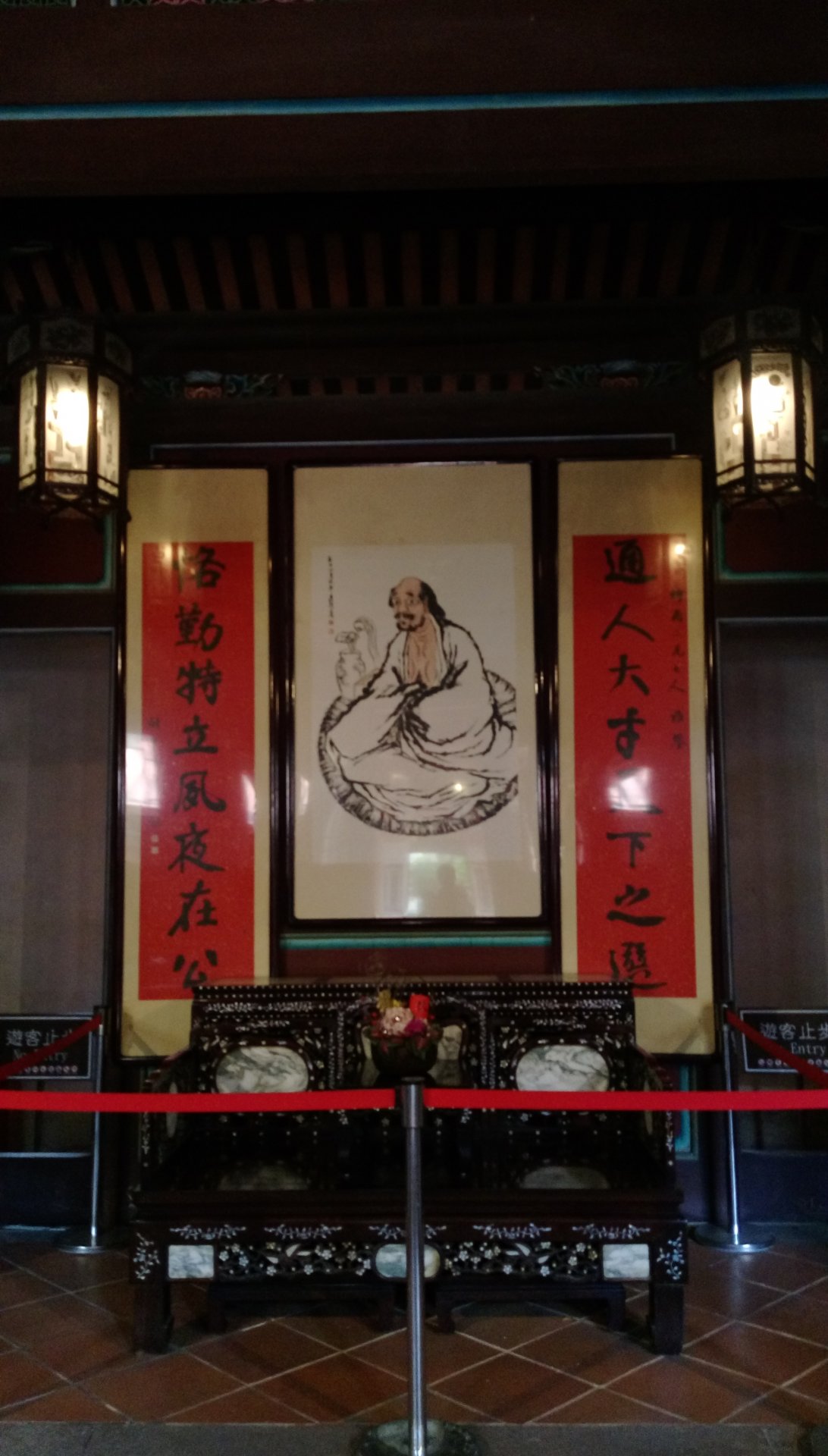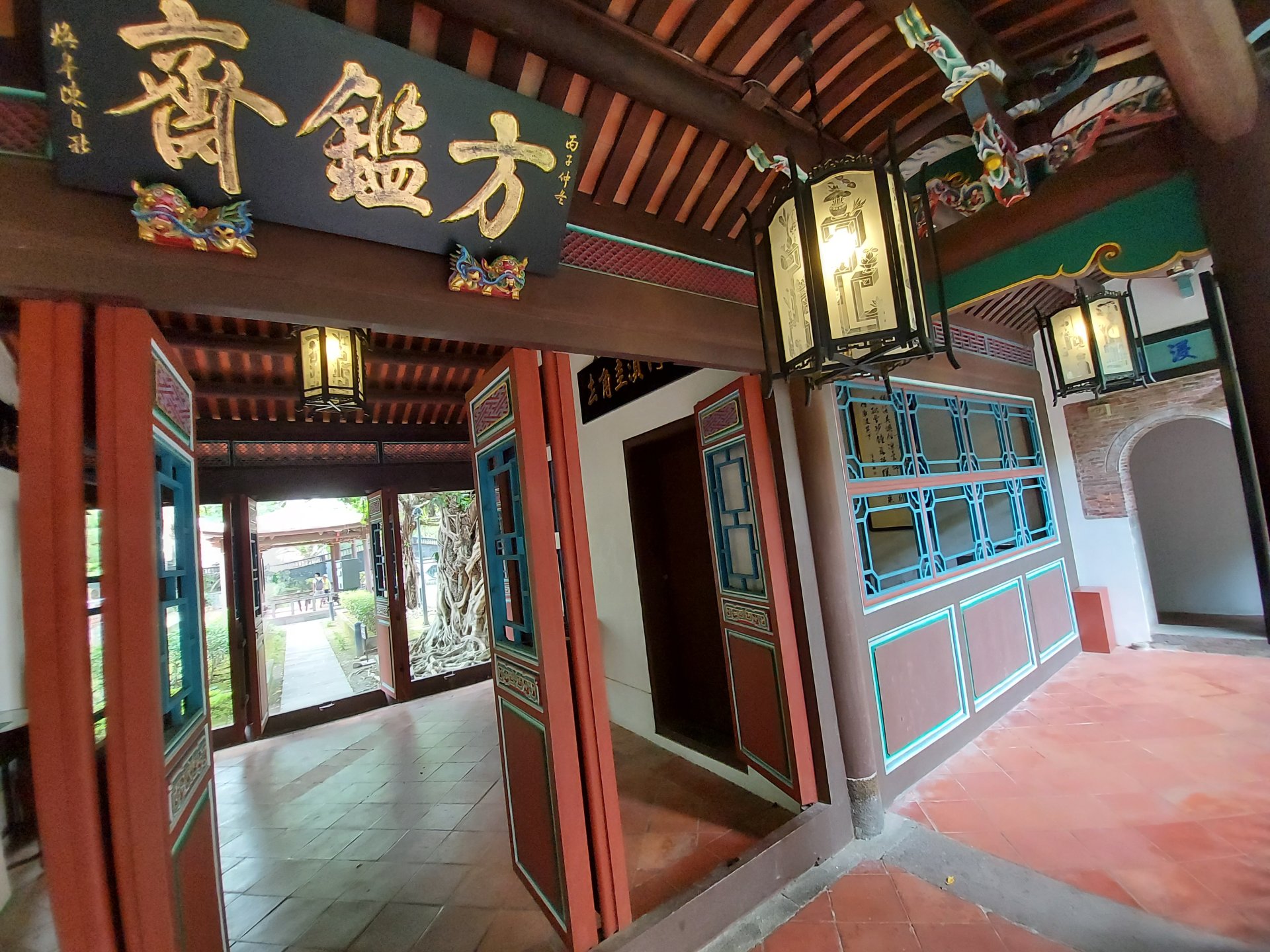 In addition to being a socialization venue, antiques and paintings were displayed in the hall. Inspired by Great Learning: “The point where to rest being known, the object of pursuit is then determined; and, that being determined, a calm unperturbedness may be attained to. To that calmness there will succeed a tranquil repose. In that repose there may be careful deliberation, and that deliberation will be followed by the attainment of the desired end” (James Legge, trans.), the Lin family named the hall in this way to hope that their descendants could “be determined”, “attain calm unperturbedness”, and seek “tranquil repose”. In the atrium stands a gable-roofed cloister with three doors at the entrance to lead guests of different social status to the main hall. All doors would be opened only for guests of higher social ranks. Entering the inner hall, the portrait of Bodhidharma is in sight. It is a finger painting made by Weng, Tung-He, the mentor of Emperor Guangxu of the Qing dynasty, witnessing the prominence of the Lin family.