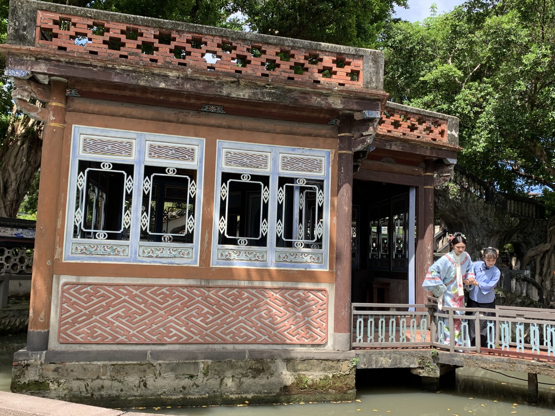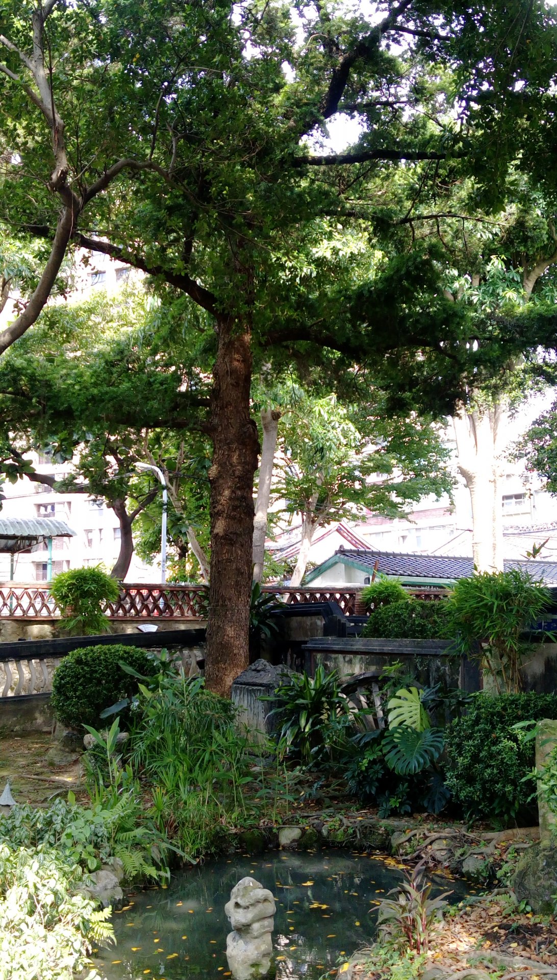 Therefore, the route for visiting the Lin Family Mansion and Garden twists, turns, rises, and falls. Sometimes, visitors must cross a bridge; other times, they may need to pass through bushes and wood, and the view is always “blocked”. For example, at the cave gate on both sides of the patterned wall in the yard of Dingjing Hall, you will find that the “cave” has framed a parallel view for you as you move around. This is the landscaper’s crafty design. Passing through the Moon Gate, the Ruyi Pond in sight brings a Buddhist sense as found in a Japanese garden. The pond is also an ecological pond specially designed in the garden in 2018 for water quality improvement by growing water-purifying plants. The stone standing by the pond was a popular type of monument during the Japanese rule.