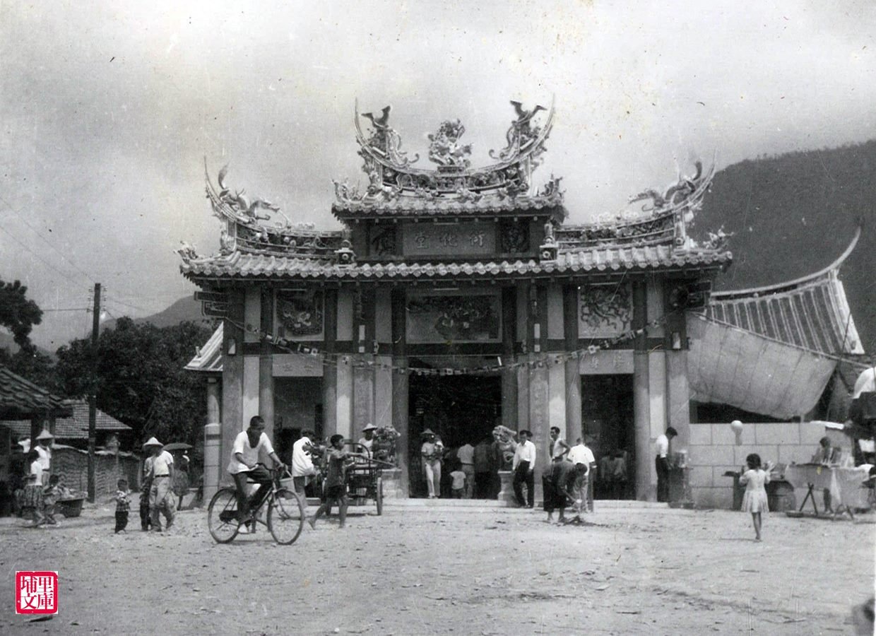 據衍化堂的沿革發展所載,民國39年11月埔里昭平宮育化堂(孔子廟)應牛眠里居民之請,前往開設牛眠山衍化堂,當時委請仕紳蘇樹木先生擔任堂主主其事,另陳景賢、陳石鍊、 施文彬、陳南要、林來福、王梓聖等參與之。圖為民國51年8月牛眠山庄衍化堂前的舊影像,當時衍化堂新建高大華麗的三川殿應落成不久,與周邊民居土角厝形成強烈的對比。