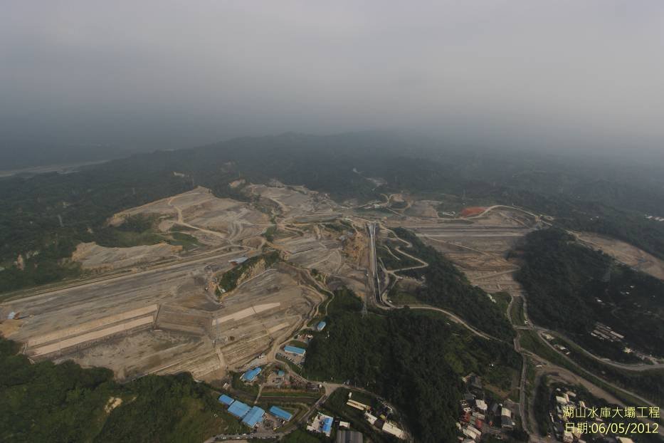 大壩工程包含位於土地公坑溪之湖山主壩、位於中坑溪之湖山副壩及位於南勢坑溪之湖南壩等三座壩,大壩體斷面採用中央心層分區滾壓式土石壩設計,壩頂寬度10 公尺,壩頂標高EL216m,壩頂最大高度75 公尺,壩體上下游坡度分別為1V:3H 及1V:2.5H。上游擋水壩採均質土石壩設計,擋水壩於完成擋水任務後併入主壩內,本工程基礎採用塑性混凝土截水牆其厚度、深度及長度各為1 公尺、30~55 公尺及2298.43 公尺。