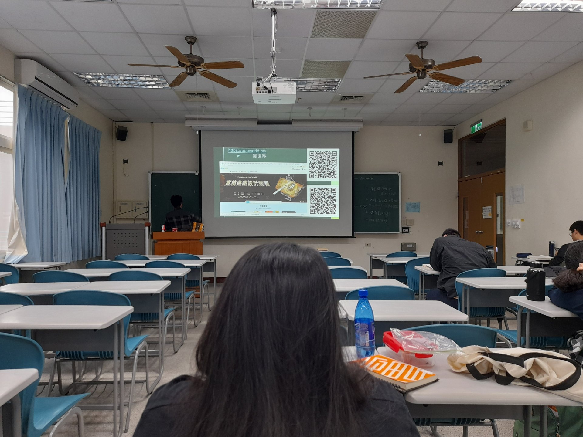 這是上課的地方,院上的族群學生會也會使用教室進行例會活動;族文系的系員大會也辦在這裡。學生幾乎都不會坐在前面的位子,都會坐在後面做自己做的事啊。