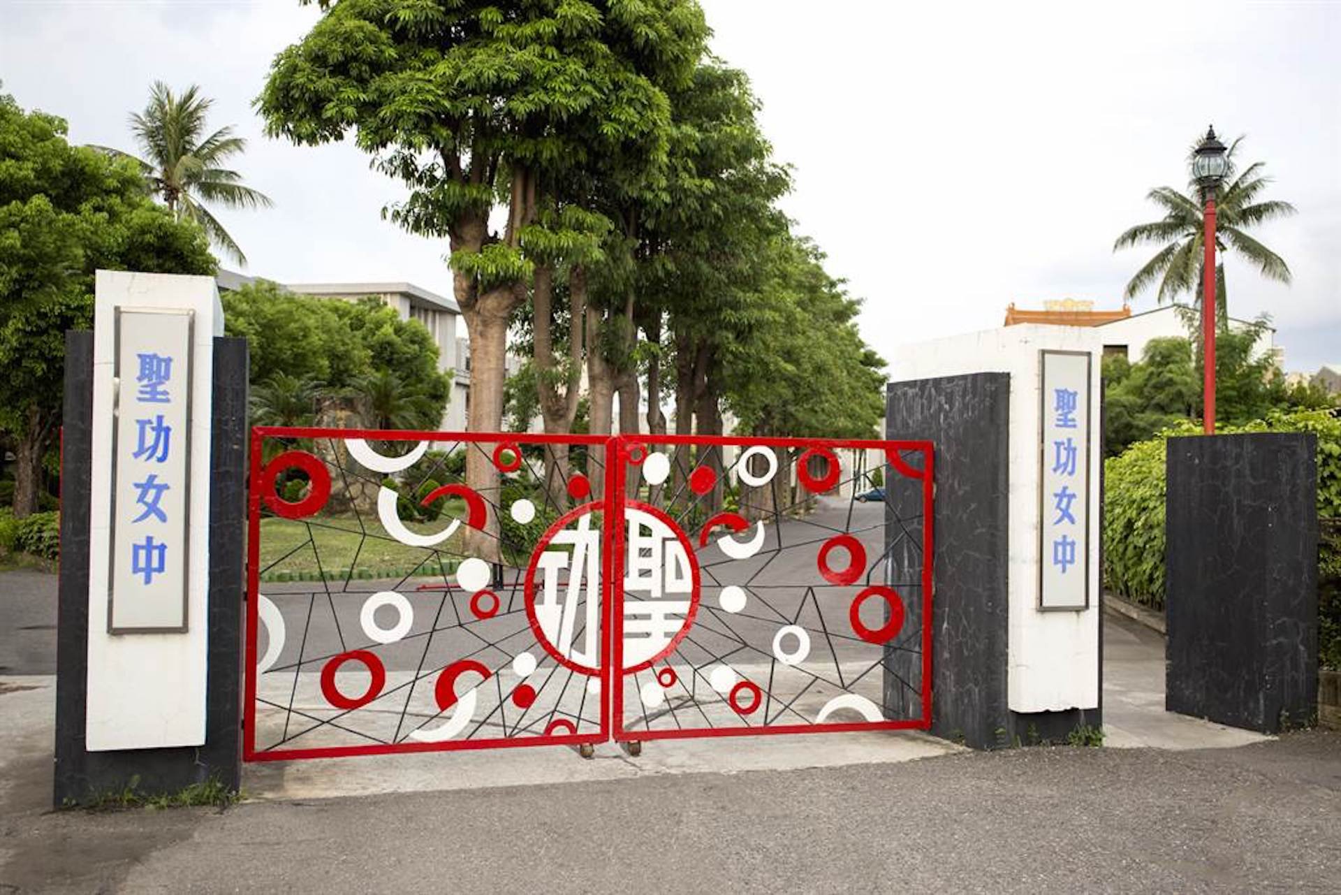 這座校門是由在台復校的傅正彩修女精心設計,校門上也特別將「聖功」兩字融入其中心,意旨太陽般的放射出光芒。其他部分則是由許多大大小小的實心、空心圓及圓弧,意謂學生可以圓滿的學習,成為全人的教育。但因鐵路地下化工程的關係,這座校門已於2019年7月拆除。
