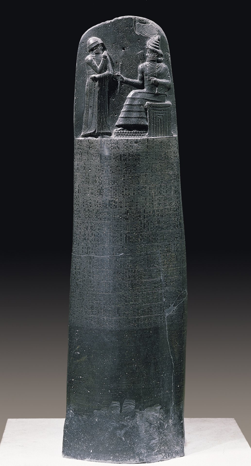 《漢摩拉比法典》是世界上最完整的成文法典(並非最早)。以阿卡德楔形文字雕刻在黑色玄武岩上,由巴比倫太陽神沙馬什賜予。全方面繼承蘇美文化,宗教、文學、建築沒有太大變化。許多黏土板上抄寫著條文,證明法典應為全體人民所知。以蘇美地區當時的技術水準來看,此石碑可說是最古老的宮廷美術,且有一定水準。