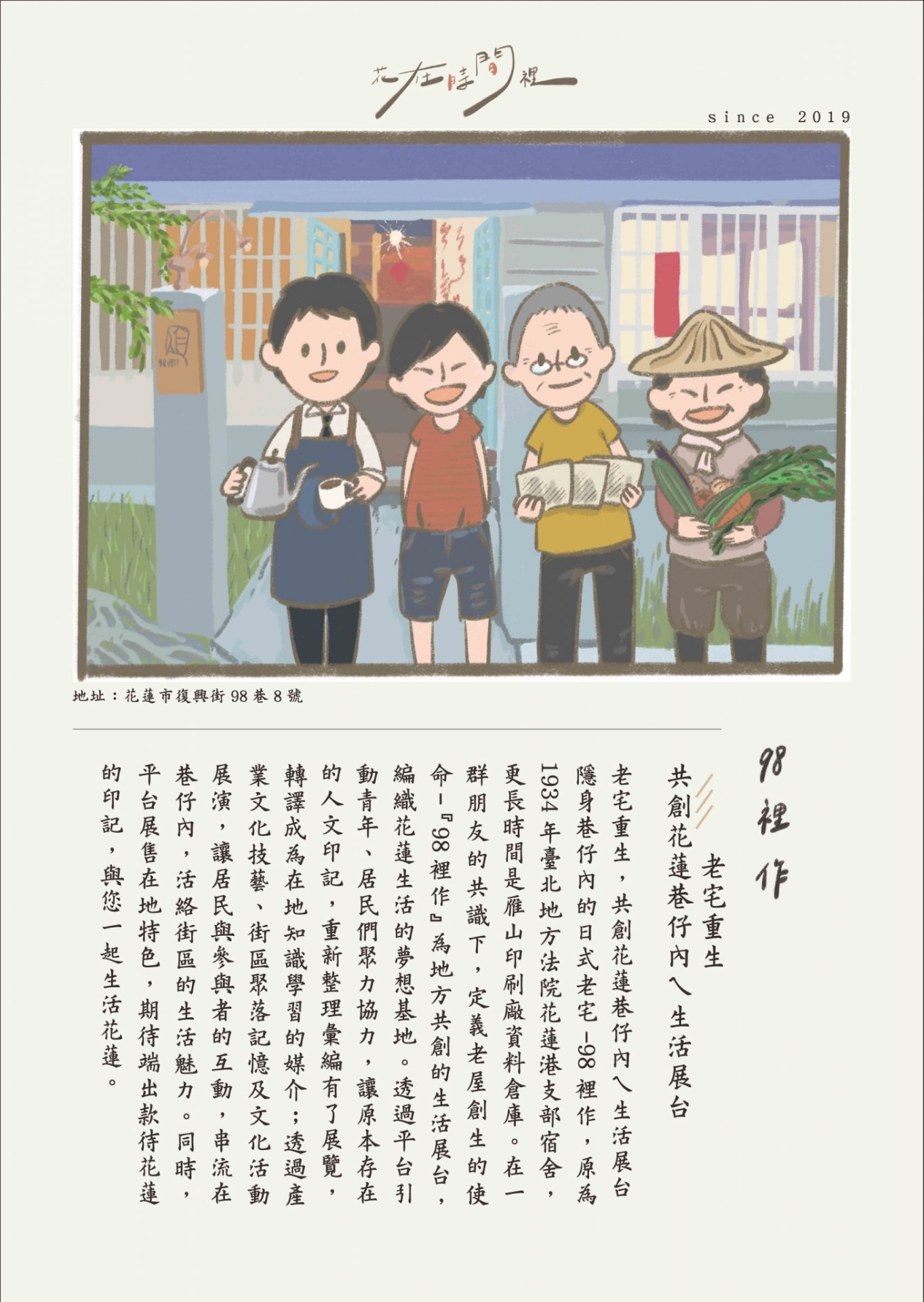花蓮,每天迎接第一道曙光的山海城市,人文薈萃的城市風貌,存續著巷仔內不變的人情味。隱身巷仔內的日式老宅-98裡作,原為1934年台北地方法院花蓮港支部宿舍,更長時間是雁山印刷廠資料倉庫,在一群朋友的共識下,定義老屋創生的使命-「98裡作」為地方共創的生活展台,編織花蓮生活的夢想基地。