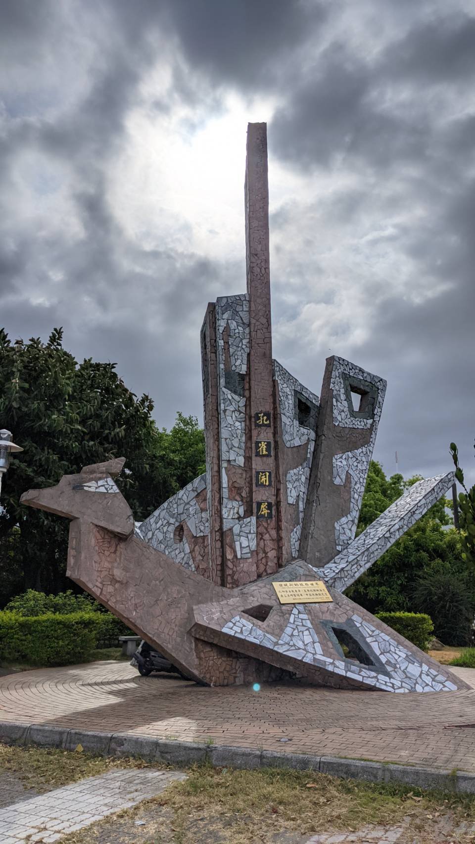 美崙溪河濱公園位於美崙山西側山腳,公園入口有一座明顯地標,大理石景觀作品─孔雀開屏,使用花蓮特產大理石拼貼而成,具有代表花蓮的特色。