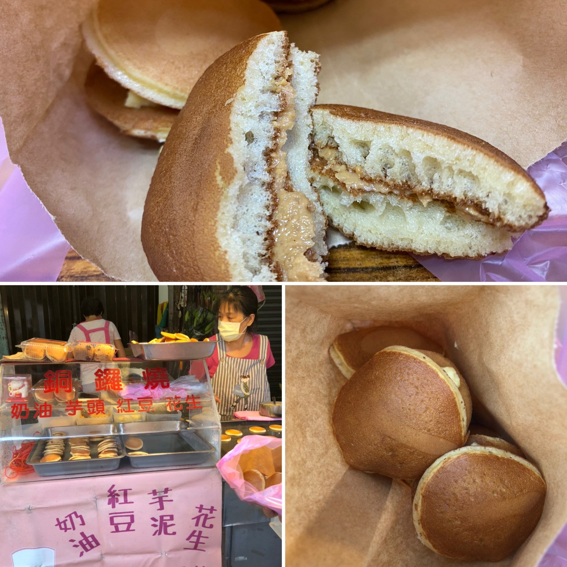 當時去的人潮還好我們買完了就走了,可能時段不一樣畢竟是早上,人們大多都會把銅鑼燒當成甜點來享用,這家銅鑼燒分別有三種口味:奶油、紅豆、芋頭、花生。