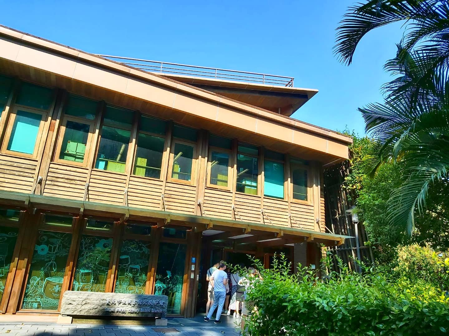 新北投圖書館位於北投公園中,四處是綠意盎然的高大樹叢,在走進公園裡到圖書館的路程,有小溪流過樹木環抱的圖書館并不顯突兀。