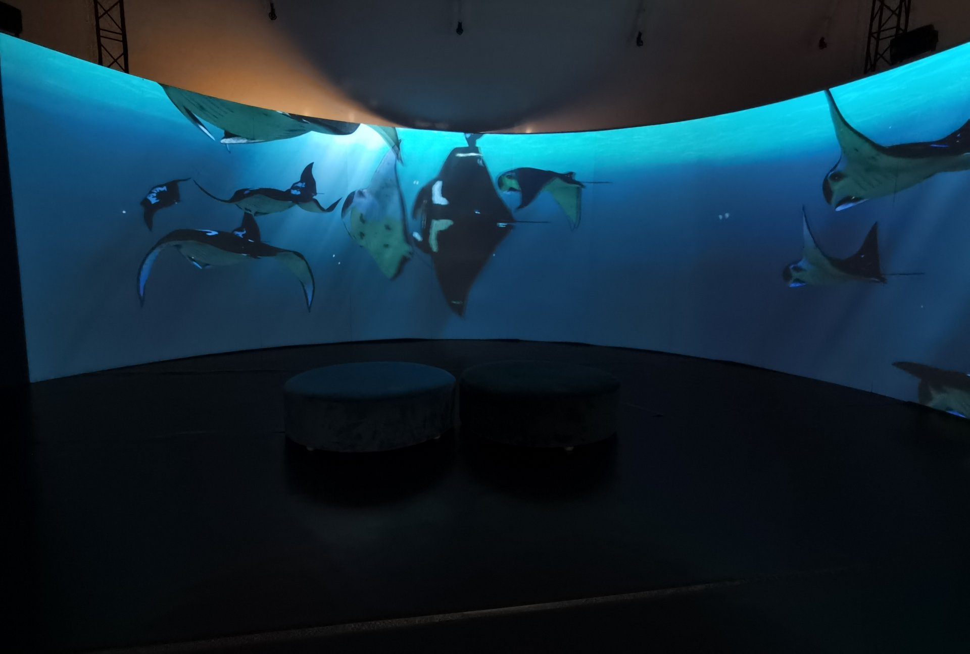 透過大型弧幕影片可了解海洋裡的巨大生物。