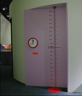 小朋友站在紅色區域上,頂部的感應器量度高度後會在旁邊顯示屏上顯示出數據。