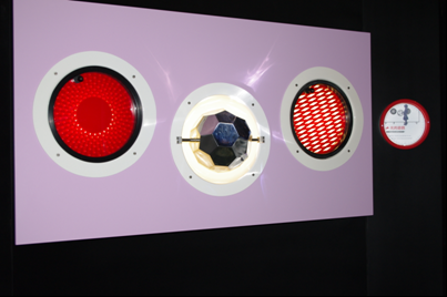 轉動中間的多面體球或兩側的圖案板〈條紋或圓洞〉,透過多面體球和簡單的圖案板,讓小朋友觀察和學習光的反射原理。