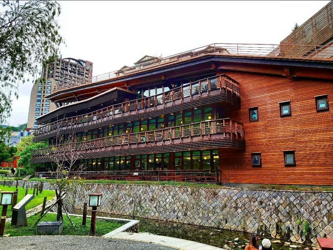 新北投圖書館位於北投公園中,四處是綠意盎然的高大樹叢,在走進公園裡到圖書館的路程,有小溪流過樹木環抱的圖書館并不顯突兀。