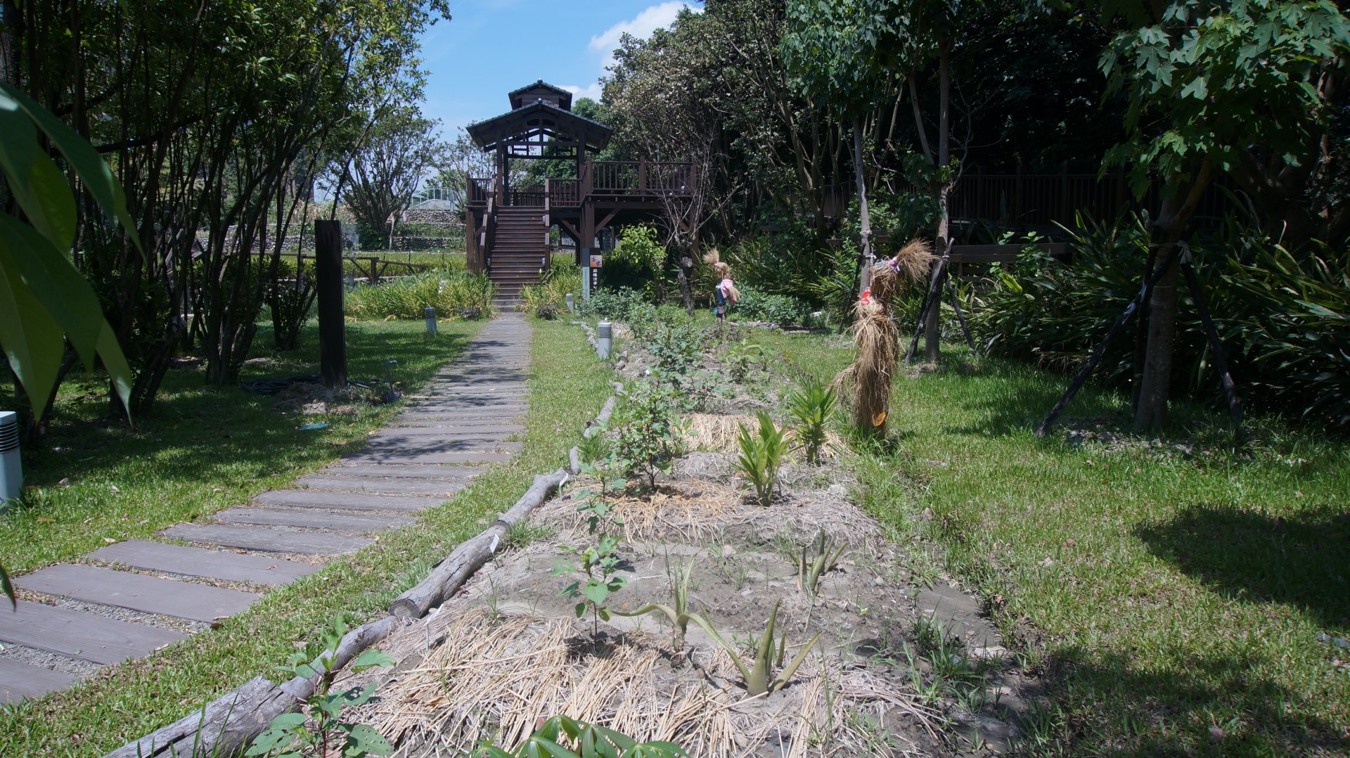 平袒的硬鋪面則提供高齡者較安全的使用空間,硬鋪面的綠化,常只能使用盆器。結合兩者,在公園的「鐵馬驛站」上,放置了數台用回收棧板打造的客家農場「食農列車」,搭配陶盆與盆栽組合,協助讓廣場的人車分流,與周邊的林地綠意連成一片,讓原本單調的鋪面,顯得生氣蓬勃。