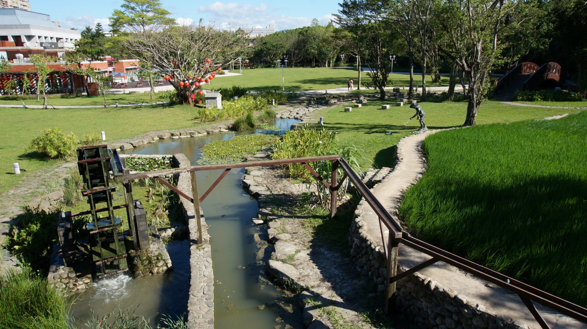 溝渠內有一座「水車」,是農業社會重要的灌溉設施,也是前人的農藝的智慧。透過動力將水盛裝、引至高處的稻田灌溉,為農夫節省許多的人力,生態溝渠與梯田的水資源循環利用,也象徵客家族群追求生態永續的精神。