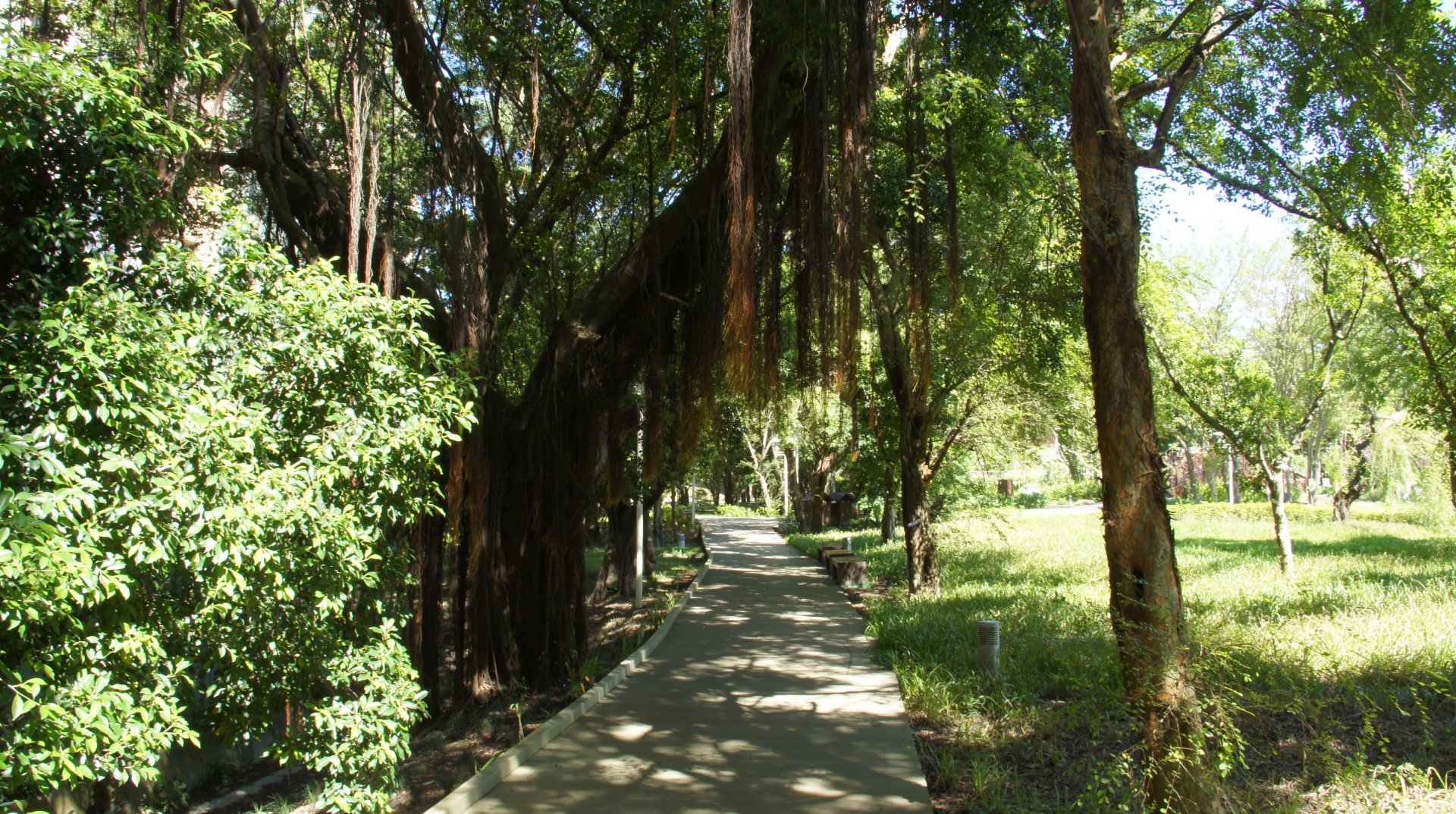 「榕樹」是市樹,也是公園最大綠覆面積的樹種。正榕因生長需要而有了氣生根,但常因為影響人的通行而遭到剪除。農場即運用導根裝置,將氣生根引導到步道的兩側,讓樹木與人可以合諧共存,當氣生根得以輸送養份、水份時,也會變得粗壯而具有一定支撐能力,也成為長時間在地演化的氣生根景觀。期間的樹木管理是持續維護的過程,也能從中傳遞客家先民愛物惜物、敬天愛地,與自然共生的生活哲學。
